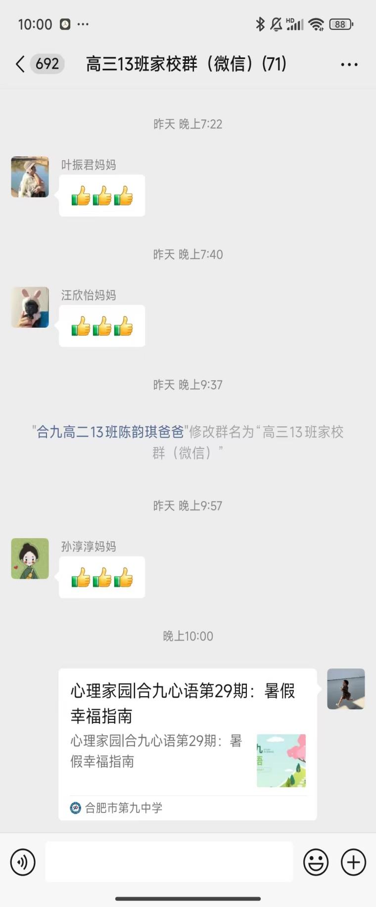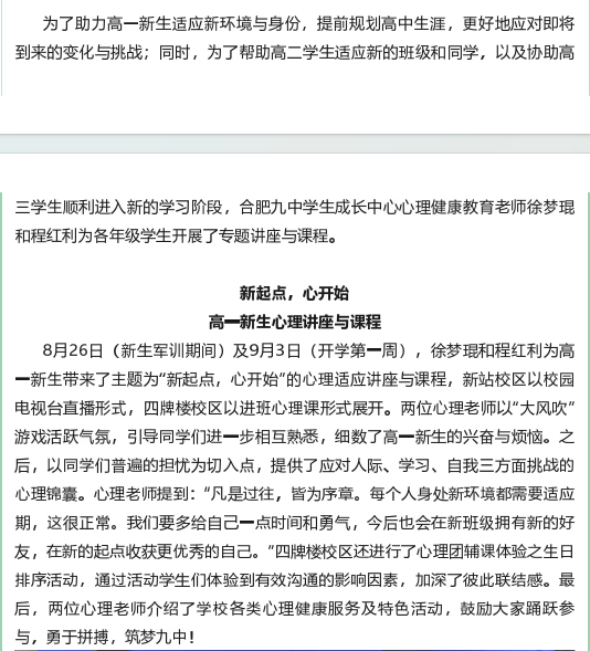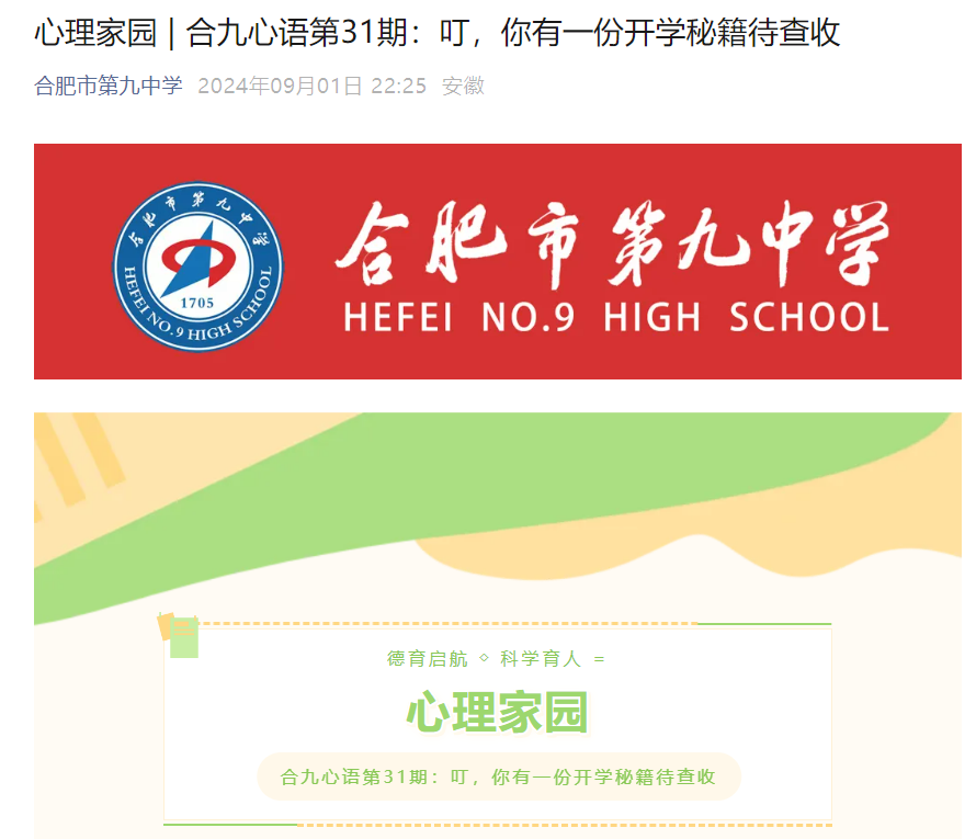 开学前,学校及时制作并转发宣传心理健康知识的文章和视频,如学校公众号9月1日推送的“合九心语第31期:叮,你有一份开学秘籍待查收”相关视频、文章,引导学生顺利度过开学适应期,以积极平稳的心态迎接开学。