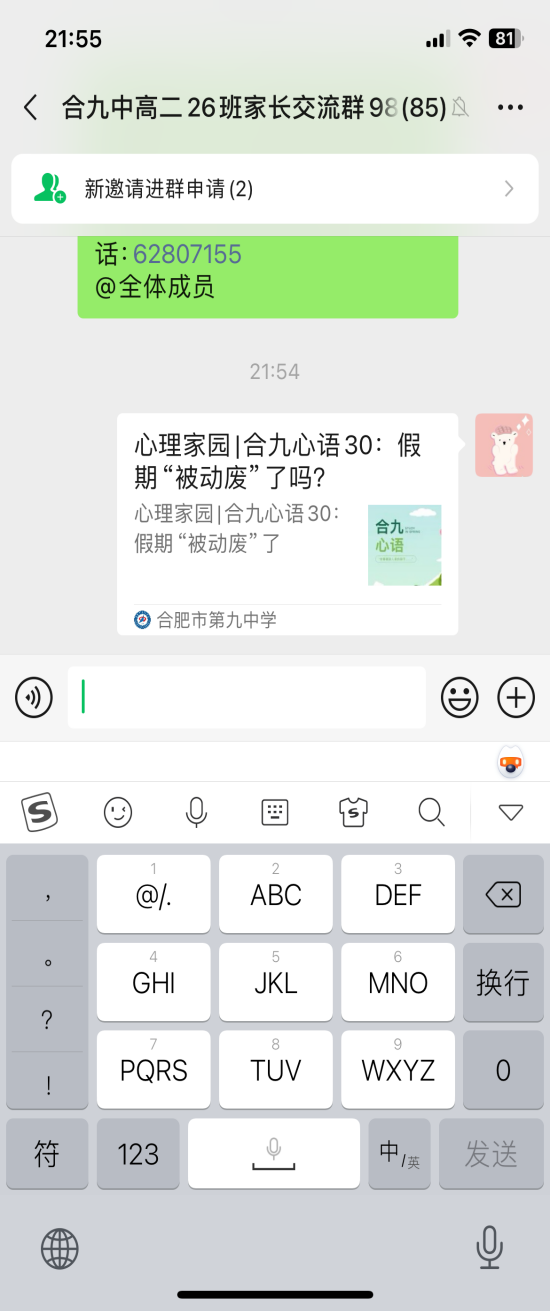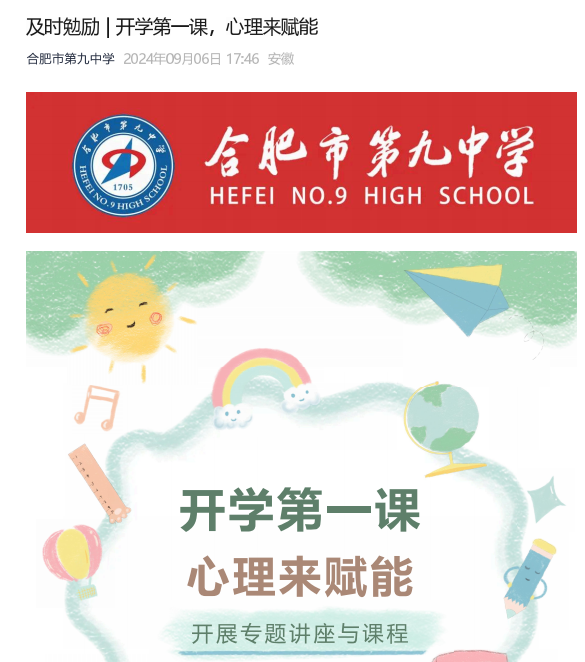 合肥九中认真落实“开学第一课”相关要求,积极开展心理健康教育系列活动,加强心理健康教育知识宣传,积极疏导学生返校时的焦虑心理,家校合力共同帮助学生平稳度过开学适应期,为学生愉快舒心返校、身心健康发展贡献一份力量。