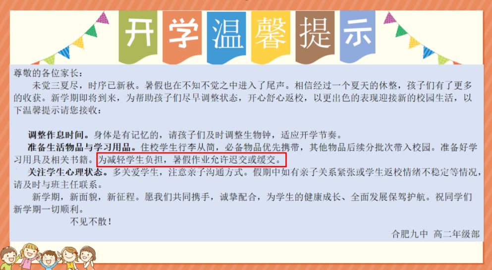 根据规定各校设立“暑假作业缓交期”,允许学生在开学两周内补交作业,并严禁各校在开学前两周组织任何形式的考试考查。我校老师在年级部的组织下,暑假期间会定期检查学生作业,更好地督促学生完成暑假任务,也方便老师与家长沟通,进行家校共育。设立“作业缓交期”是避免孩子从非常放松的环境,突然进入上学被约束的状态产生心理上的不适和压力,给同学们一个过渡期。在开学第一课、班会上,各班班主任都强调了这一点。