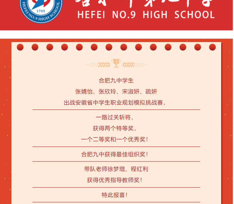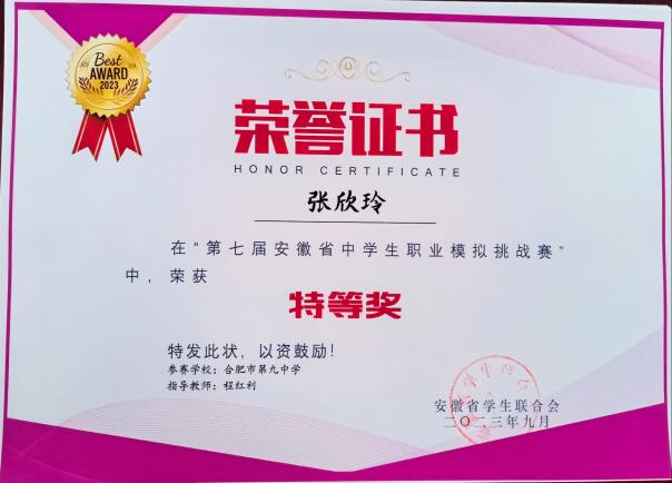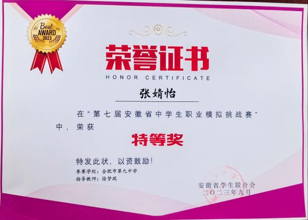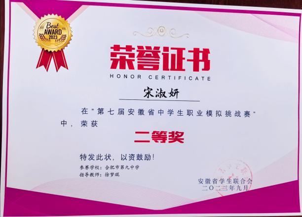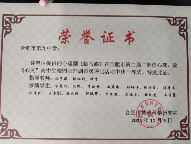 积极创办校内各类比赛,鼓励学生参加校外比赛。假期幸福火花打卡、成长中心书签设计、书写我心、“声入人心”配音秀、“逐梦青春,书写未来”生涯规划书撰写、“治愈心灵,演绎青春”心理情景剧剧本等赛事,激发了学生们的学习兴趣和创造力。优秀学子代表学校参加市赛省赛也获得了很多成绩,心理剧《蛹与蝶》代表学校参加“合肥市第二届高中生心理情景剧大赛”获一等奖,学生张婧怡、张欣玲、宋淑妍、疏妍代表学校参加“安徽省第七届职业模拟挑战赛”获两个特等奖、一个二等奖和一个优秀奖,学校获优秀组织奖,学校专职心理健康教师程红利、徐梦琨获优秀指导教师。