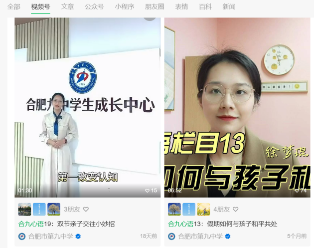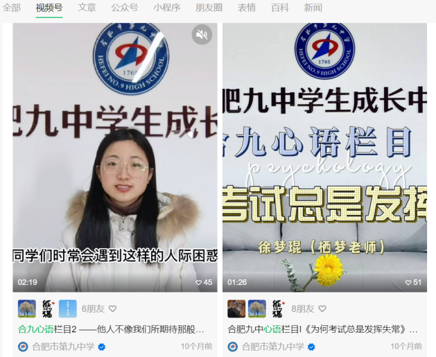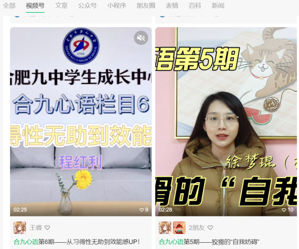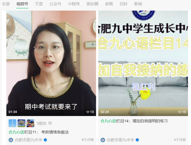 “微信视频号《合九心语》栏目”则利用新媒体手段,定期发布心理健康知识科普视频,方便学生随时随地学习。“合九心语1期 为何考试总是发挥失常?”、“合九心语4期 后疫情时代,如何进行自我关怀?”、“合九心语15期 为什么你什么事都喜欢往坏处想?”、“合九心语21 家长如何应对青少年自伤行为?”视频内容针对学生及家长普遍的误区与困扰进行讲解,提供实用性建议,助力学校学生及家长更好地解决学习生活中的各类小难题,目前已更新至第25期。