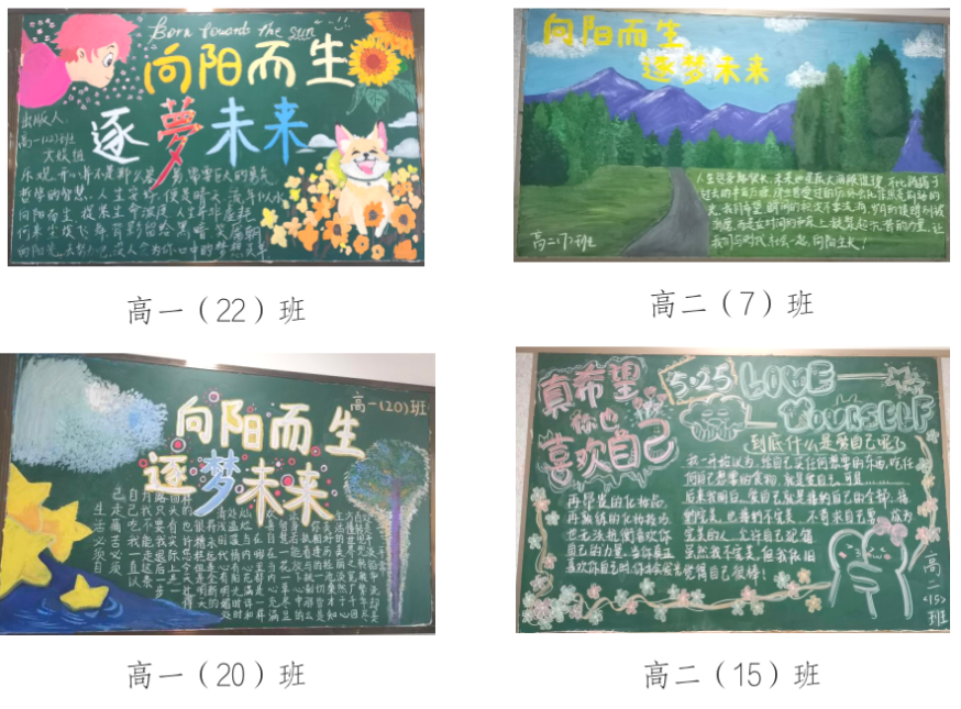 “心理健康主题宣传活动月”在每年4-6月份,以5月25日“我爱我”心理健康日为契机大量开展心理健康宣传教育工作。通过举办心理游园会、户外拓展心理活动课、“向阳而生”黑板板评比、“心晴”作品展览等活动,增强学生对心理健康重要性的认识,有效获得心理减压。