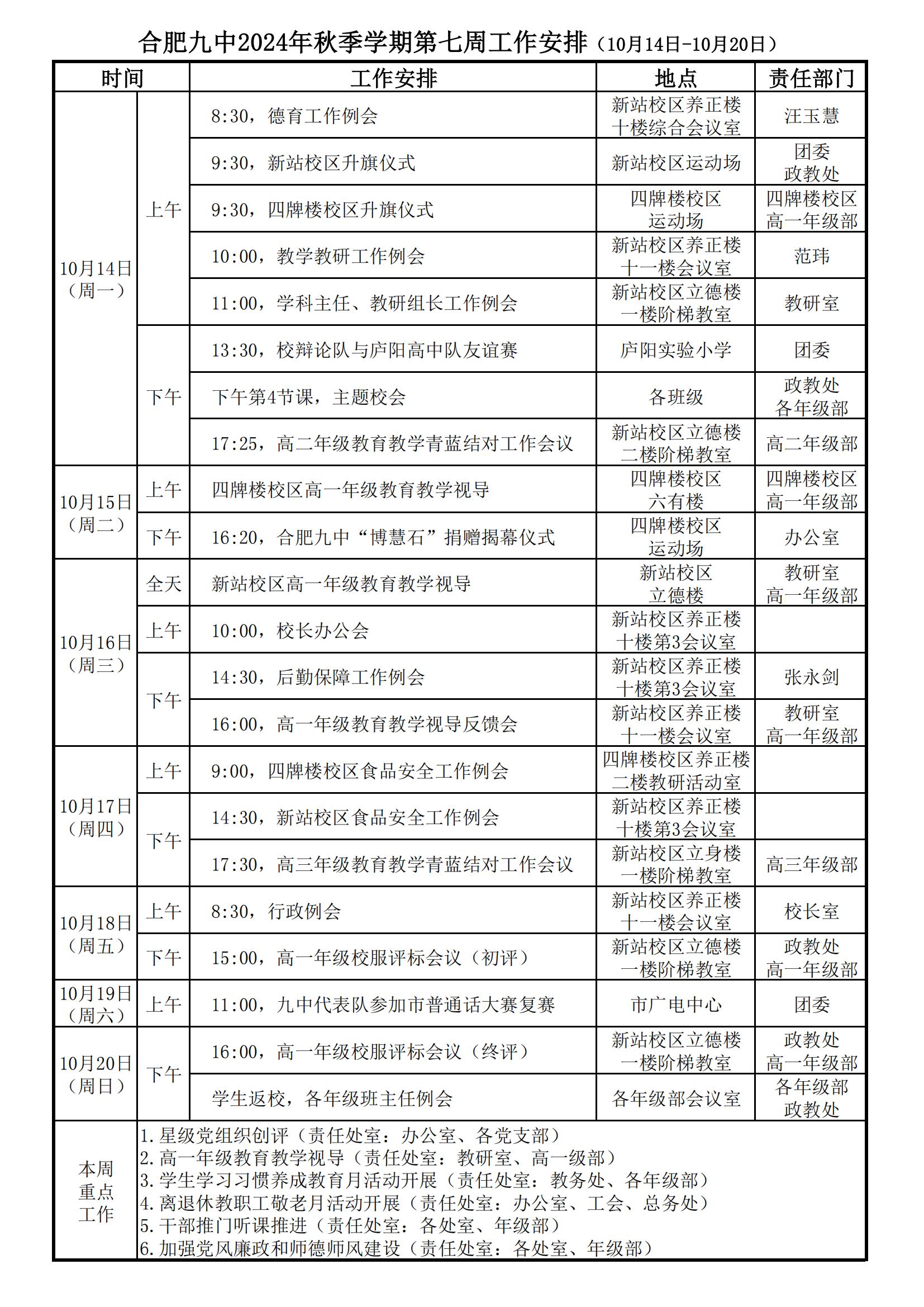 合肥九中2024年秋季学期第七周工作安排(10月14日-10月20日)