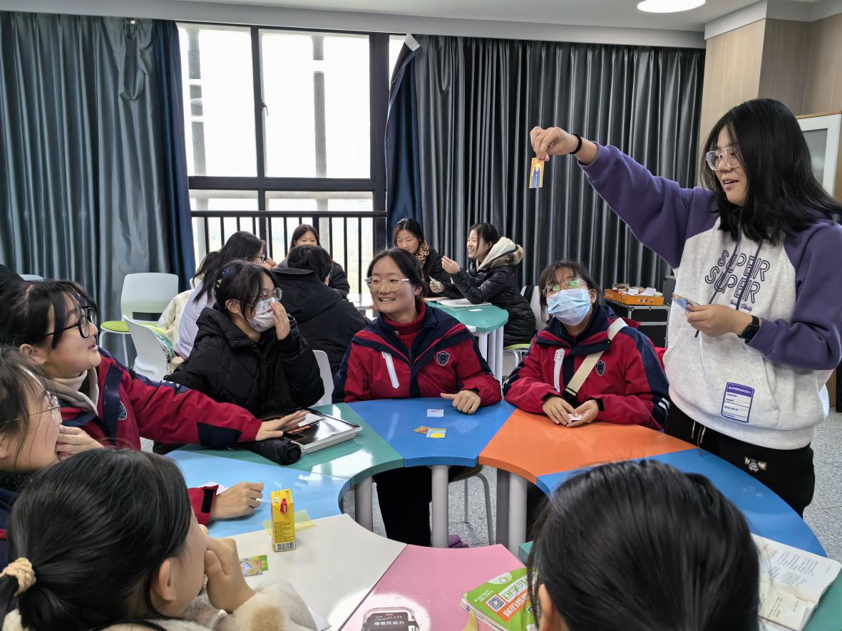 之后,徐梦琨指导同学们用左手盲抽一张卡牌,认真地感受和分析,将这张卡牌送给本组中的一位同学。同学们兴趣盎然,细细斟酌后,热情地互相赠卡并说明理由。一番欢声笑语之后,大家都收获了很多个不一样的自己,有惊喜,有惊讶,也有感动。很多同学主动上台分享自己的“旅途见闻”,教室传出阵阵笑声和掌声,同窗之间的鼓励与肯定,给了这间教室中的每个人莫大的温暖与支持。