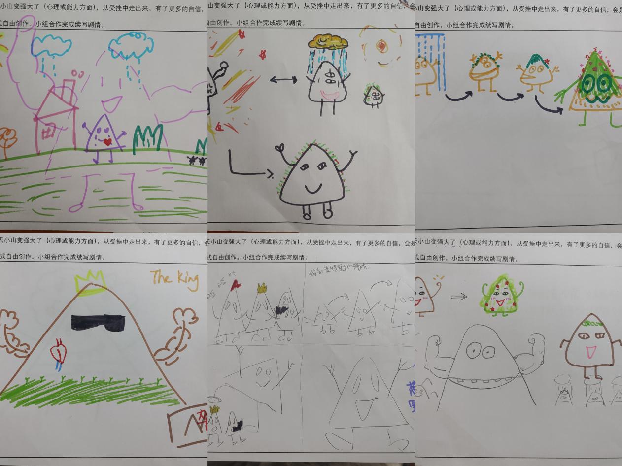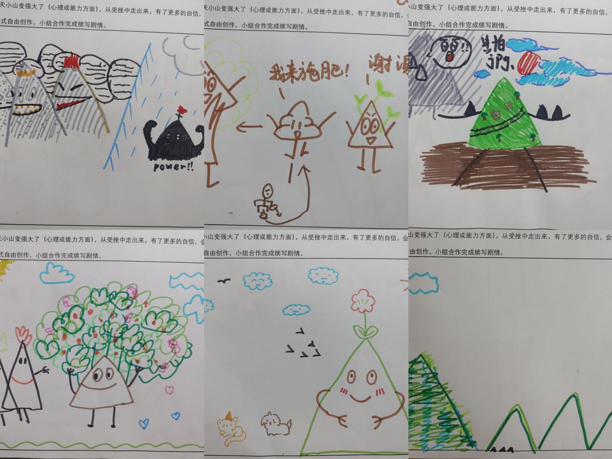 随后,学生们小组合作以漫画形式创作出土丘从受挫中走出来,在心理或能力方面变强大,找回自信后的样子。在学生们的弹幕及漫画创作中蕴含着通过拉长时间维度、转换视角、寻找社会支持、建立自身防线、忽视外界声音、发挥自身优势、积极语言激励等方式走出情绪的阴雨天,强大内心力量。“看见即疗愈”,学生们看见土丘的同时亦是面对社会比较产生负面情绪的自己被看见。看见土丘的不容易和内心的渴望,这本身就有很大的治愈力量。
