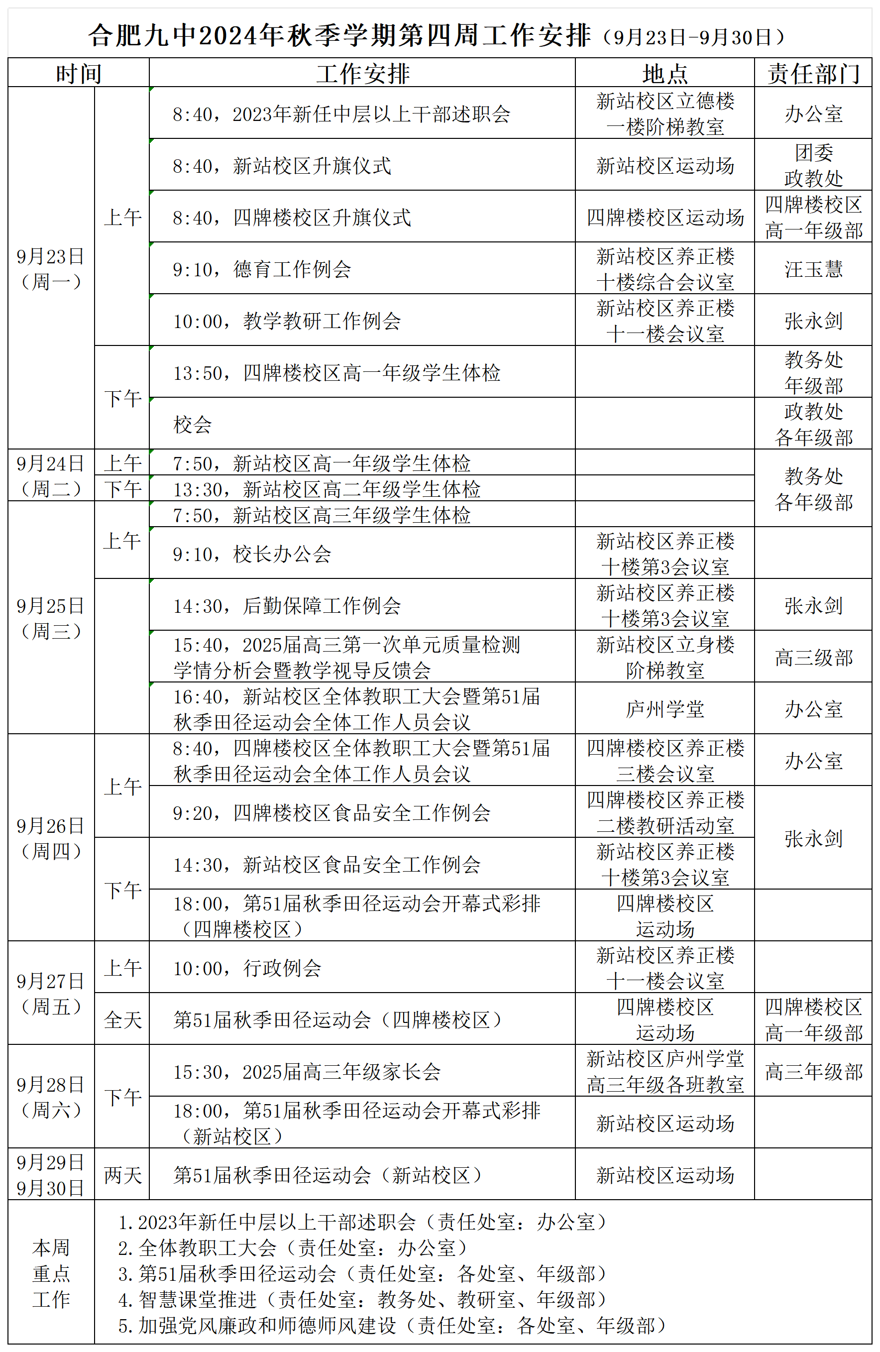 合肥九中2024年秋季学期第四周工作安排(9月23日-9月30日)