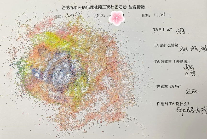 带着内心的感悟与好奇,社员们一起体验了“盐说情绪”活动,大家在徐老师的指导下,用彩色粉笔磨盐,用五颜六色的盐晶绘制情绪画作,体验绘画治疗技术的魅力,感知与调适情绪。