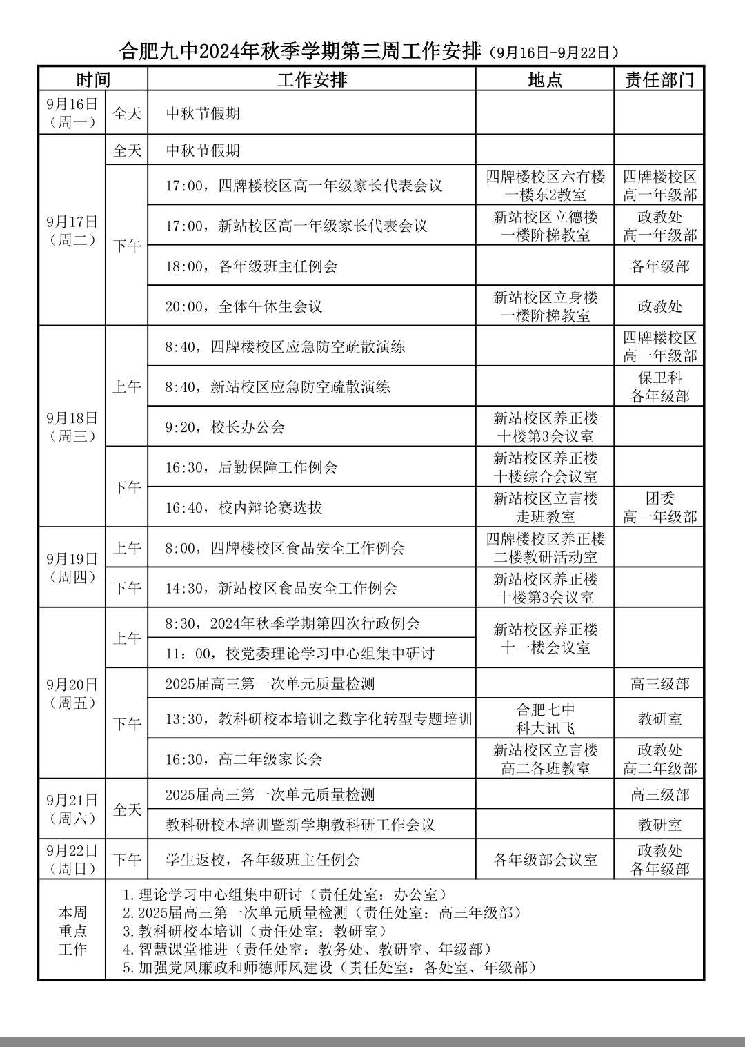 合肥九中2024年秋季学期第三周工作安排(9月16日-9月22日)
