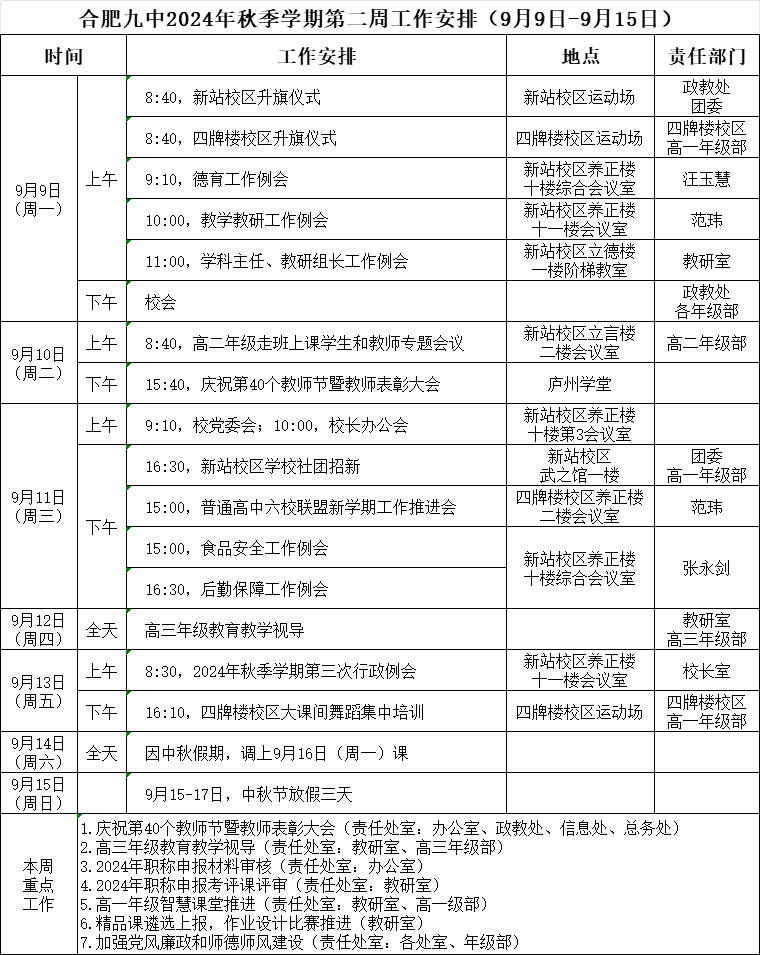 合肥九中2024年秋季学期第二周工作安排(9月9日-9月15日)