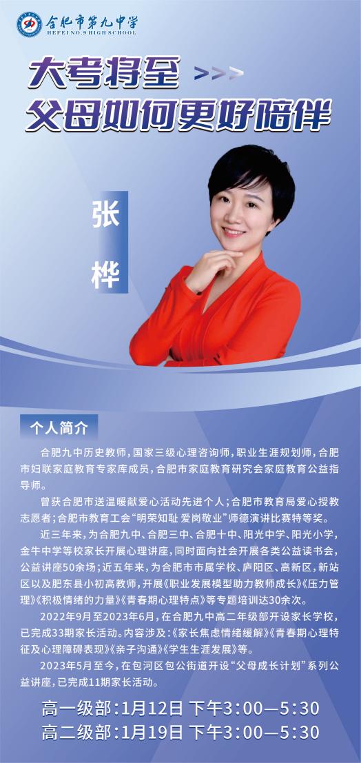 2024年1月12日,合肥九中高一年级部开展了主题为《大考将至,父母如何更好陪伴》的家长学校活动,本次家长学校由张桦老师讲授,这也是张桦老师开展的第34期家长学校工作。