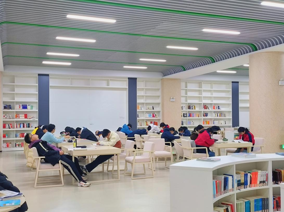 每天中午12:30,图书馆便准时迎来午休的学生们。在宽敞明亮、静谧温馨的图书馆内,学生们有序就座。有的拿出书本专注自习,沉浸于知识的海洋;有的则选择稍作休息,为下午的学习养精蓄锐。图书馆的开放时间持续到13:40,在这宝贵的七十分钟里,学生们能够合理安排自己的时间,劳逸结合。