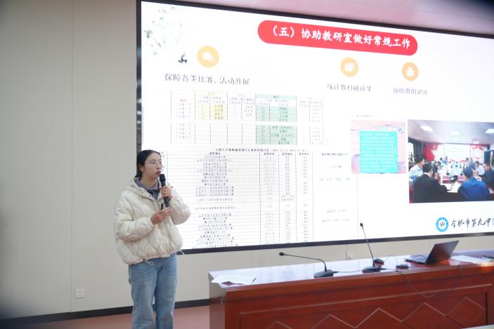新站校区高一级部教研主任陈旭琴以《研途回望,星河渐灿;新岁奋进,教研弥坚》为题开展报告。从“九层之台,起于累土——岗位履职情况”“千人同心,则得千人力——团队建设成效”“欲渡黄河冰塞川,将登太行雪满山——不足之处”三个方面展开,并对后期工作进行了展望。