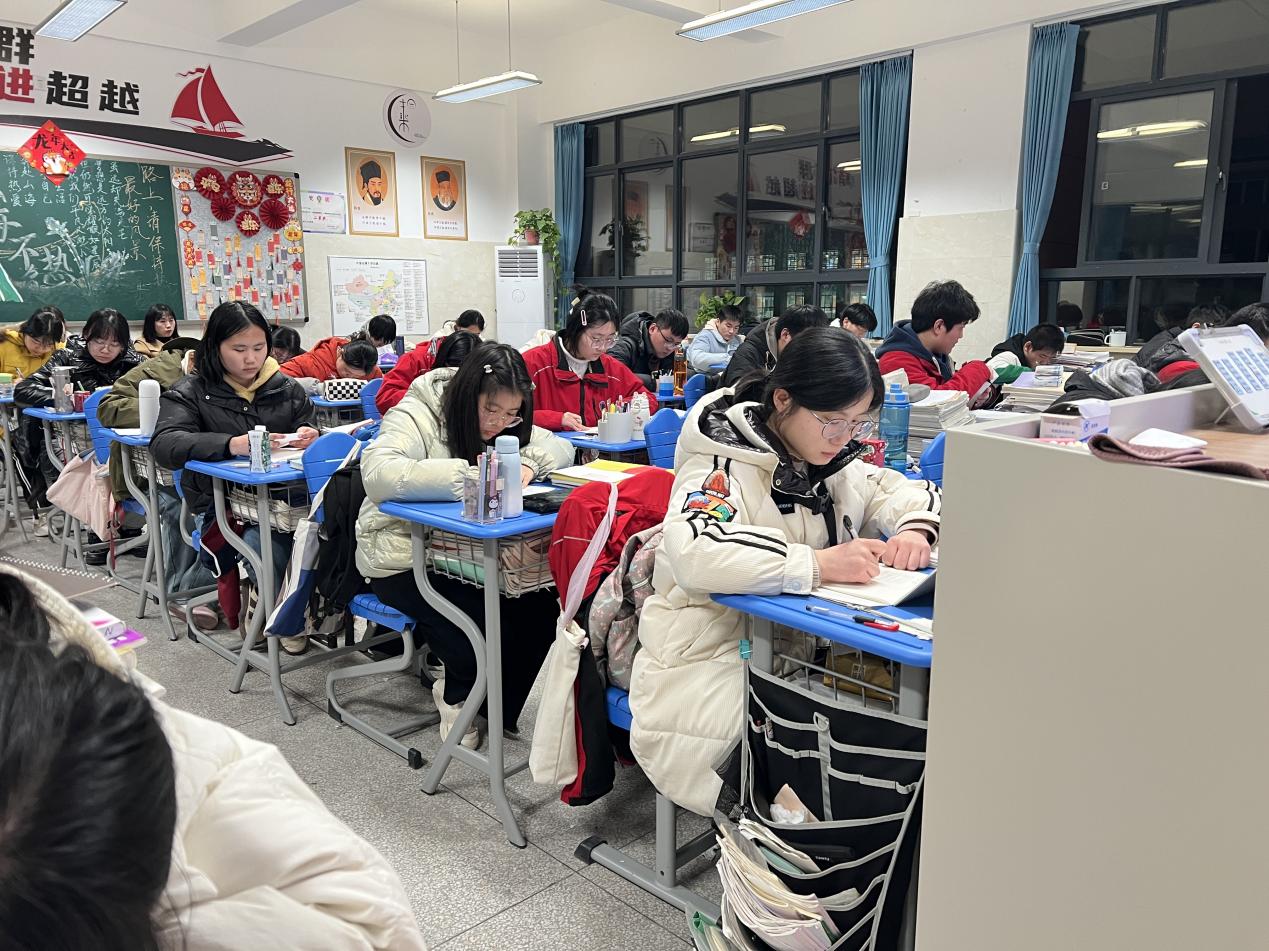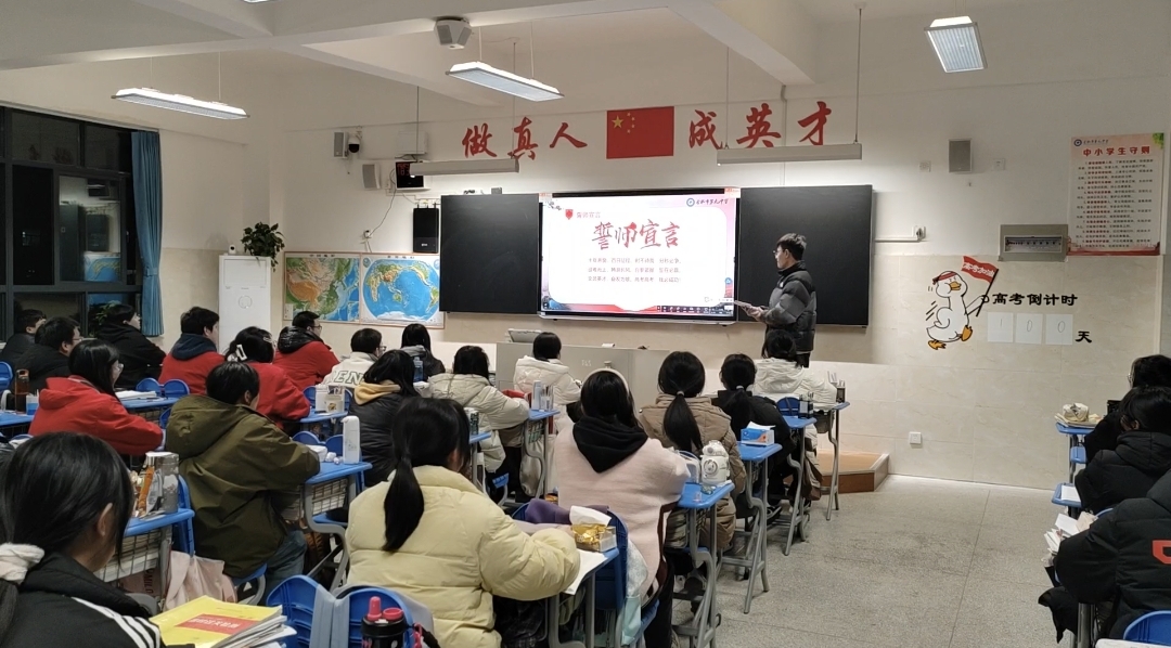 班长席一凡带领全班同学宣读誓词,铿锵有力的声音在教室里回荡,展现了同学们以“不破楼兰终不还”的决心迎战高考的坚定信念。他们的誓言不仅是对自己的鞭策,更是对青春理想的执着追求。