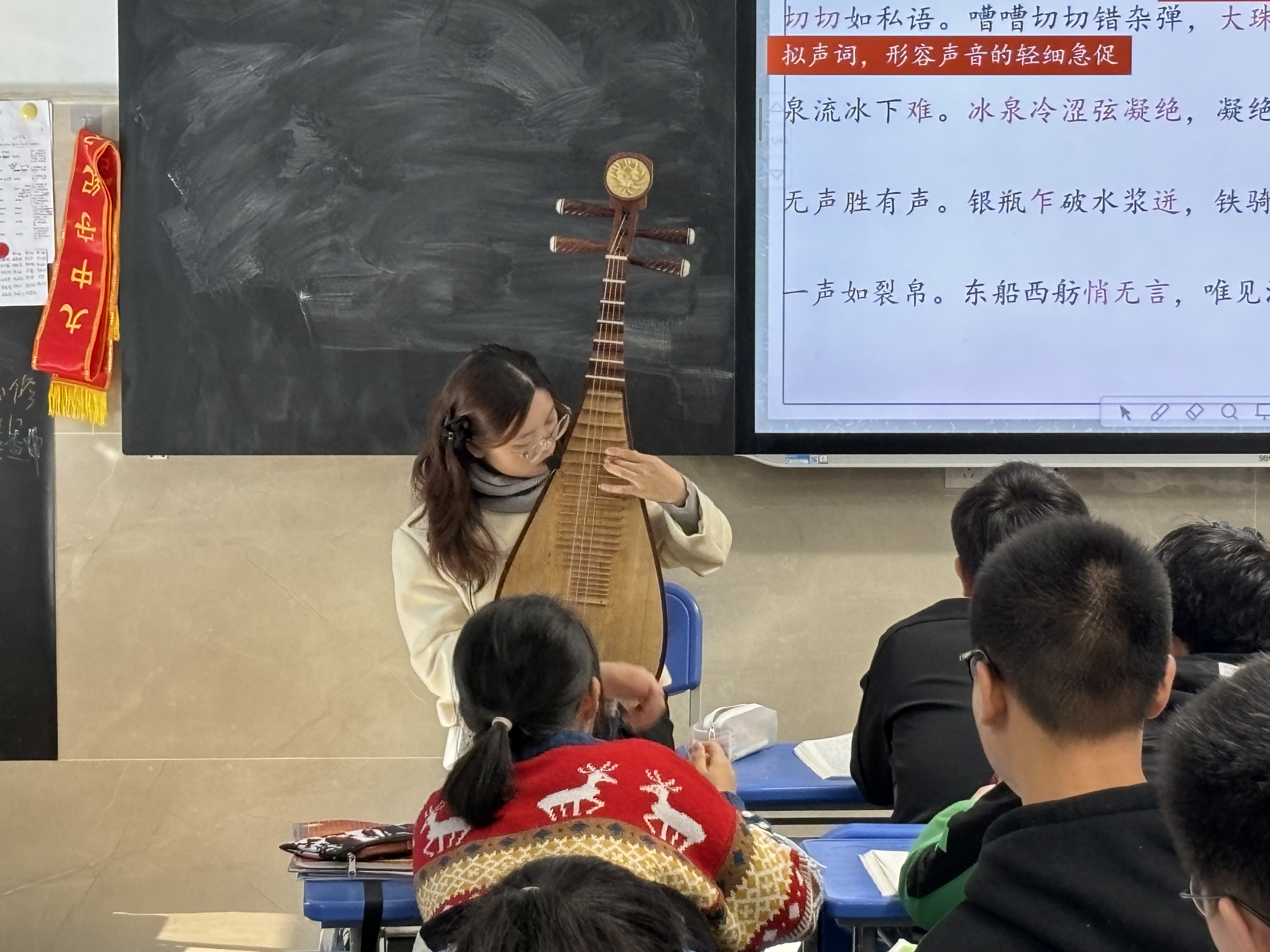 “大弦是琵琶上最粗的弦,小弦是琵琶上最细的弦,转轴拨弦三两声,其实就是在调音。”张恺婧告诉记者,自己7岁学弹琵琶,小学毕业时考过十级。在备课时,为让学生更好理解诗中所写,她便利用空余时间重拾琵琶进行练习。“如果通过多媒体播放一段音乐,让学生听一下其实也是一种简便的方法,但这种直观的教学方式我认为更能够激发学生的积极性,让语文课堂‘活’起来。”