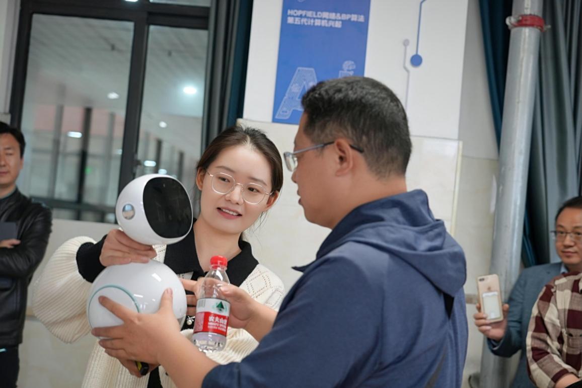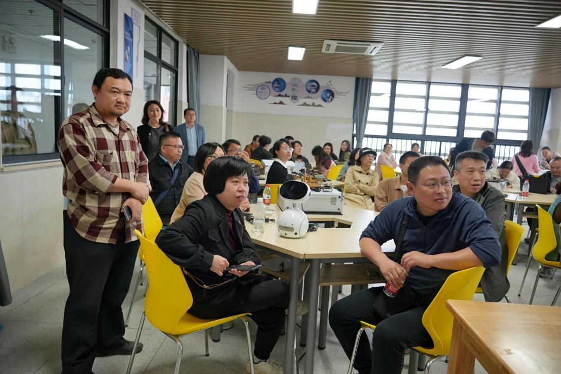 最后,南昌十中一行走进了充满科技感的人工智能室。信息技术、人工智能社团指导老师张奇奇详细介绍了学校在人工智能方面的课程设置、教学方法以及学生实践活动等情况,并与现场老师互动了学生实践成果。南昌十中的老师们对这些新奇有趣又极具教育意义的人工智能项目赞叹不已。