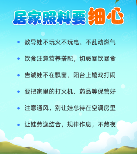 3.防范火灾事故。高温天气,容易起火,家长要注意居家用火、用电、用气安全,教育孩子不玩火,发现火情,及时拨打119。
