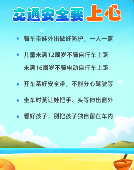 5.出行安全记心间。“一盔一带”不能忘,交通规则要遵守,文明平安过暑假。暑假是孩子们的“撒欢”时间,也是安全事故的高发期。快乐出行,平安回家!