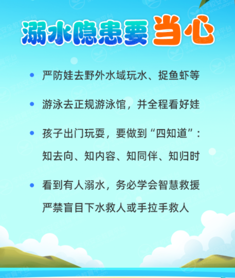 2.防范暑期溺水。高温天气孩子喜欢下水游泳消暑,加之暑假期间孩子自由时间和外出活动、旅游等增多,溺水风险随之增加,家长务必要高度警惕。严格要求孩子遵守防溺水“六不”, 孩子外出时,家长务必做到“四知道”。若无法陪伴孩子时,家长请务必委托并叮嘱其他监护人尽到看护责任。