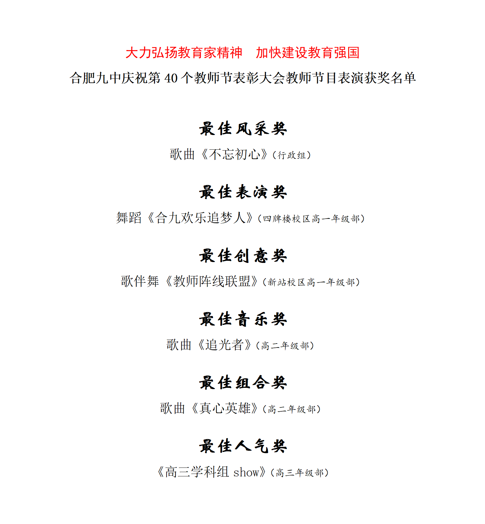 经过全体教职工的公开、公正、公平的票选,合肥九中第40个教师节庆祝大会表演获奖名单已出,让我们向获奖的老师表示热烈的祝贺!