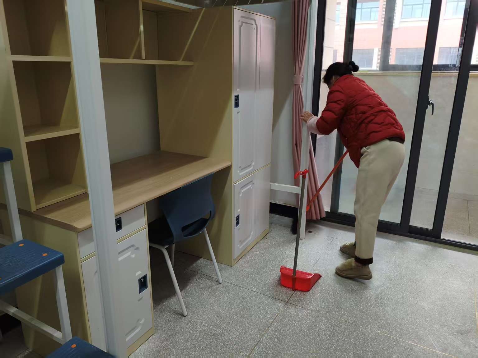 清晨,老师们便开启了生活清洁工作。她们细致地打扫每一处公共区域,不放过任何一个细节。学生寝室里,老师们也用心清扫,擦拭门窗、整理床铺,让寝室焕然一新,充满家的温馨。