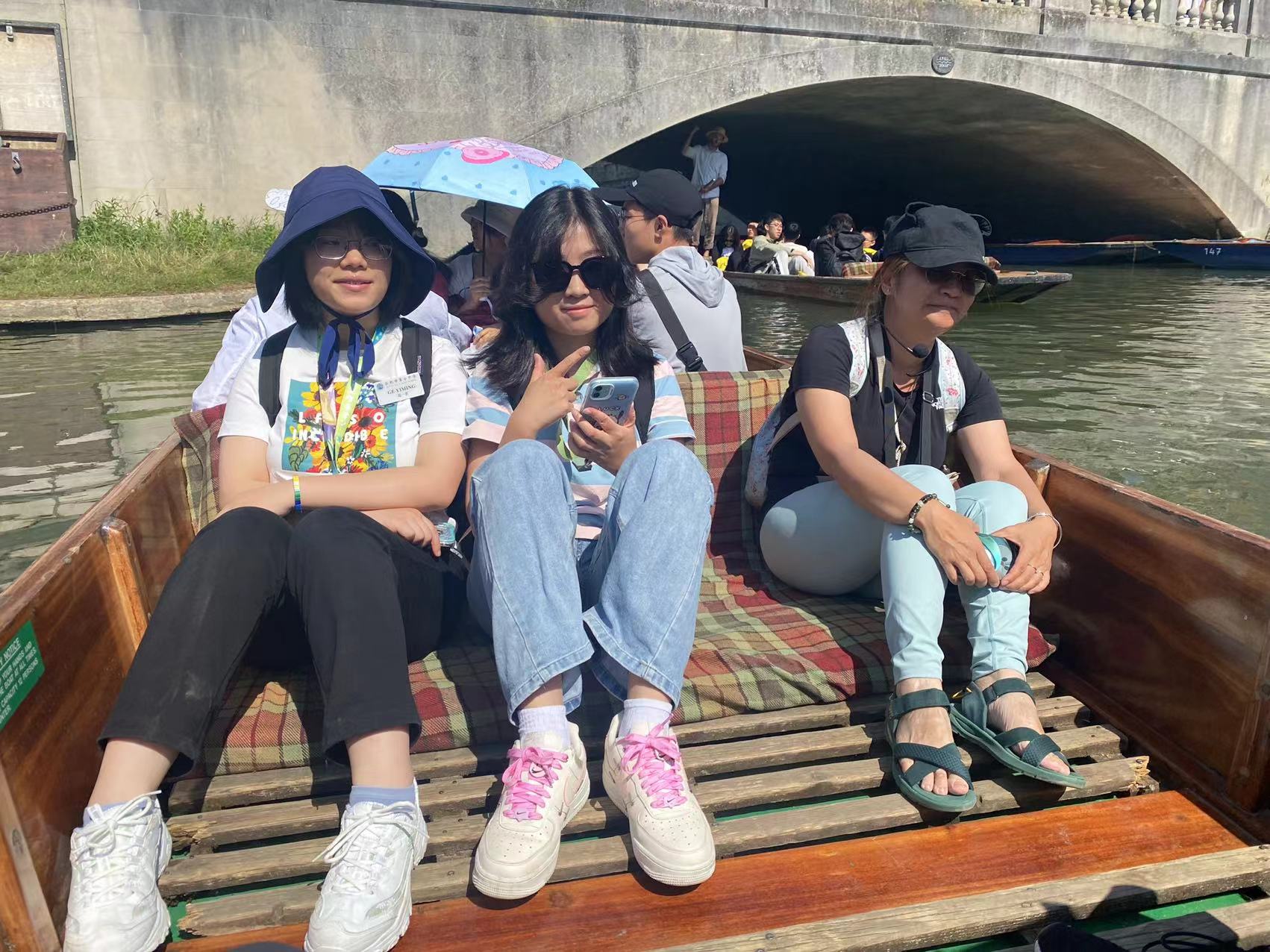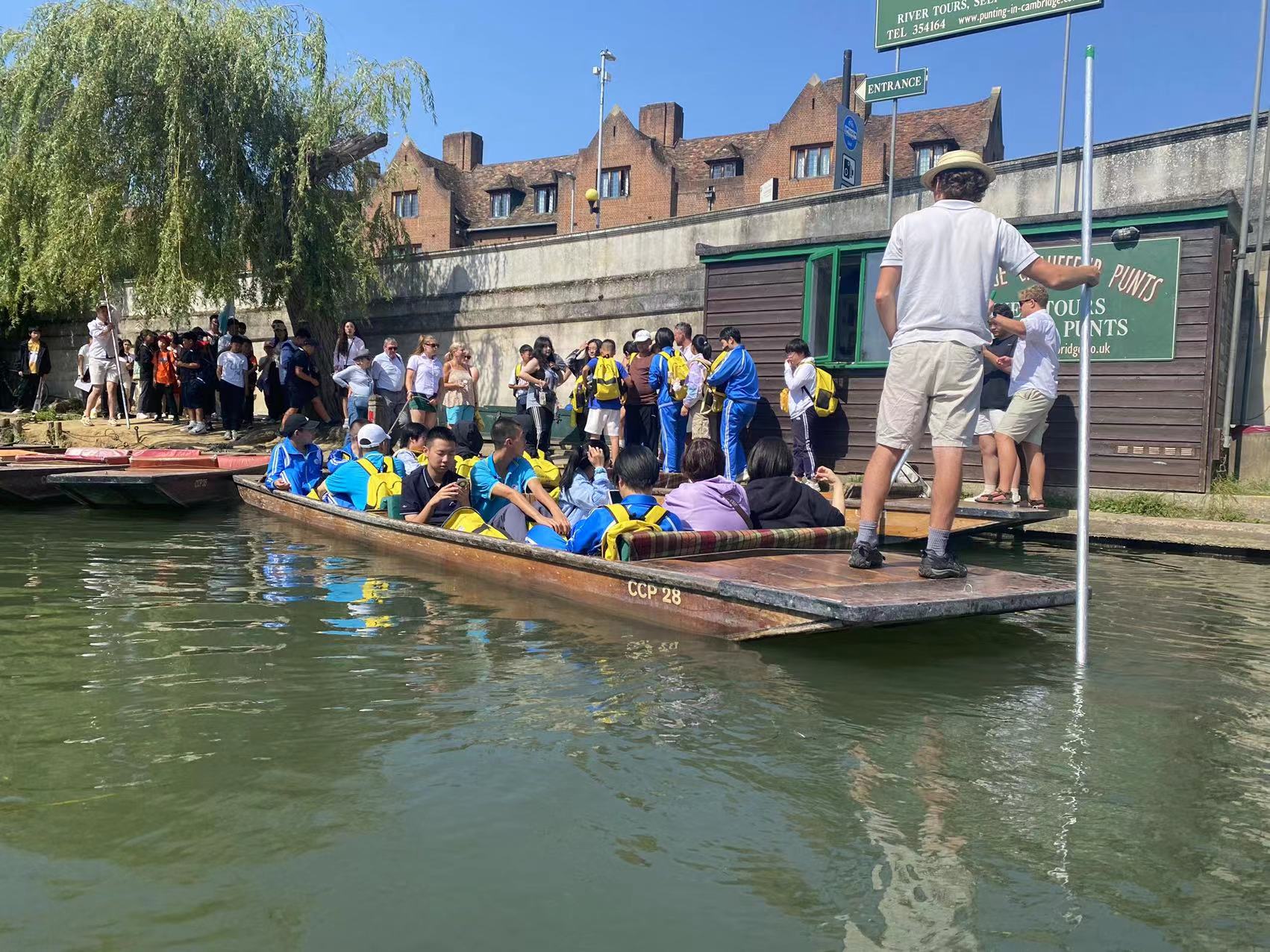 在剑桥,同学们乘船欣赏了两岸的风光。造型各异的桥梁,高大典雅的校舍,爬满青藤的墙壁,开阔青绿的草地,令同学们赏心悦目。行进在绿波之上,同学们一起吟诵起徐志摩的《再别康桥》,眼前的景与书上的诗遇合,融汇成大家心头满满的诗情画意。大家还参观了国王学院和三一学院,欣赏了恢弘的哥特式建筑,在枝繁叶茂的苹果树旁合影留念。