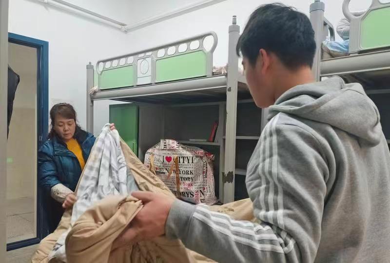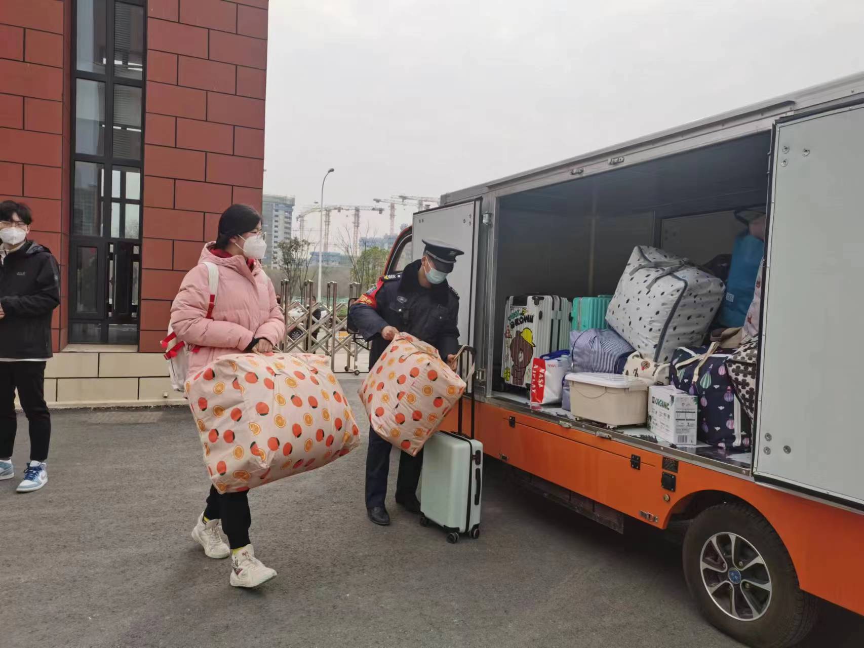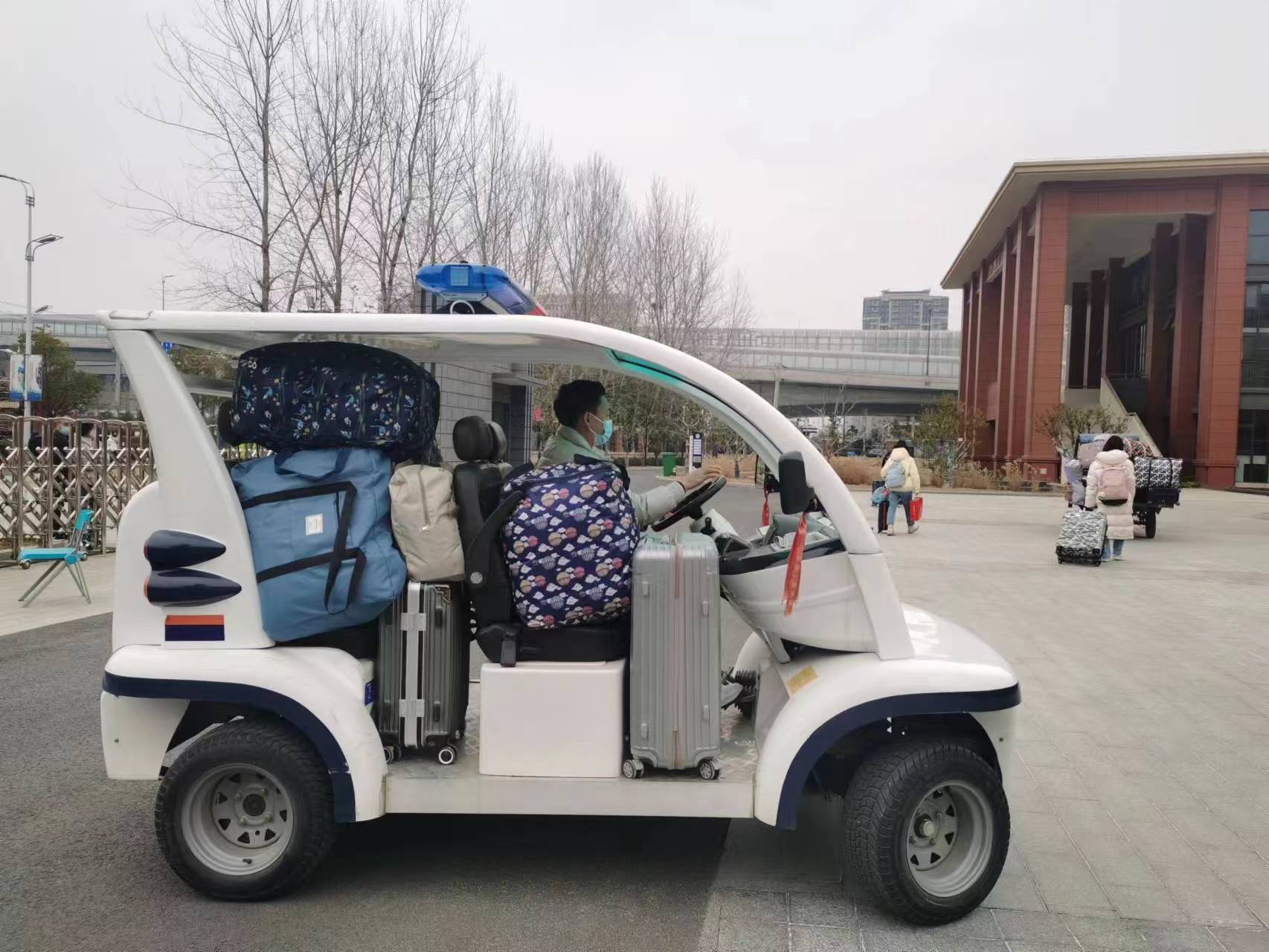 因返校学生行李、被褥等物品较多,自己难以搬运的问题。学校为了更好的服务好学生,多部门联动,成立教职工志愿者服务队,主动帮助学生搬运行李、铺设床铺,并调配巡逻车、配餐车、三轮车托运大件物品至宿舍楼,为学生提供优质的暖心服务。