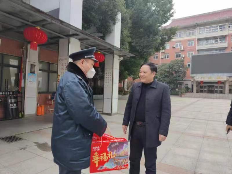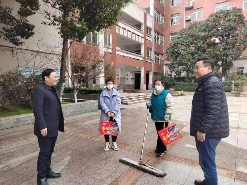 2023年1月22日,大年初一;按照学校党委书记、校长章伟的要求,由副校长许祖国率办公室、总务处、保卫科、教研室等部门负责人前往合肥九中四牌楼、新站两个校区,慰问春节期间坚守在工作岗位的14名后勤保障人员,为他们送去新春问候和诚挚祝福。