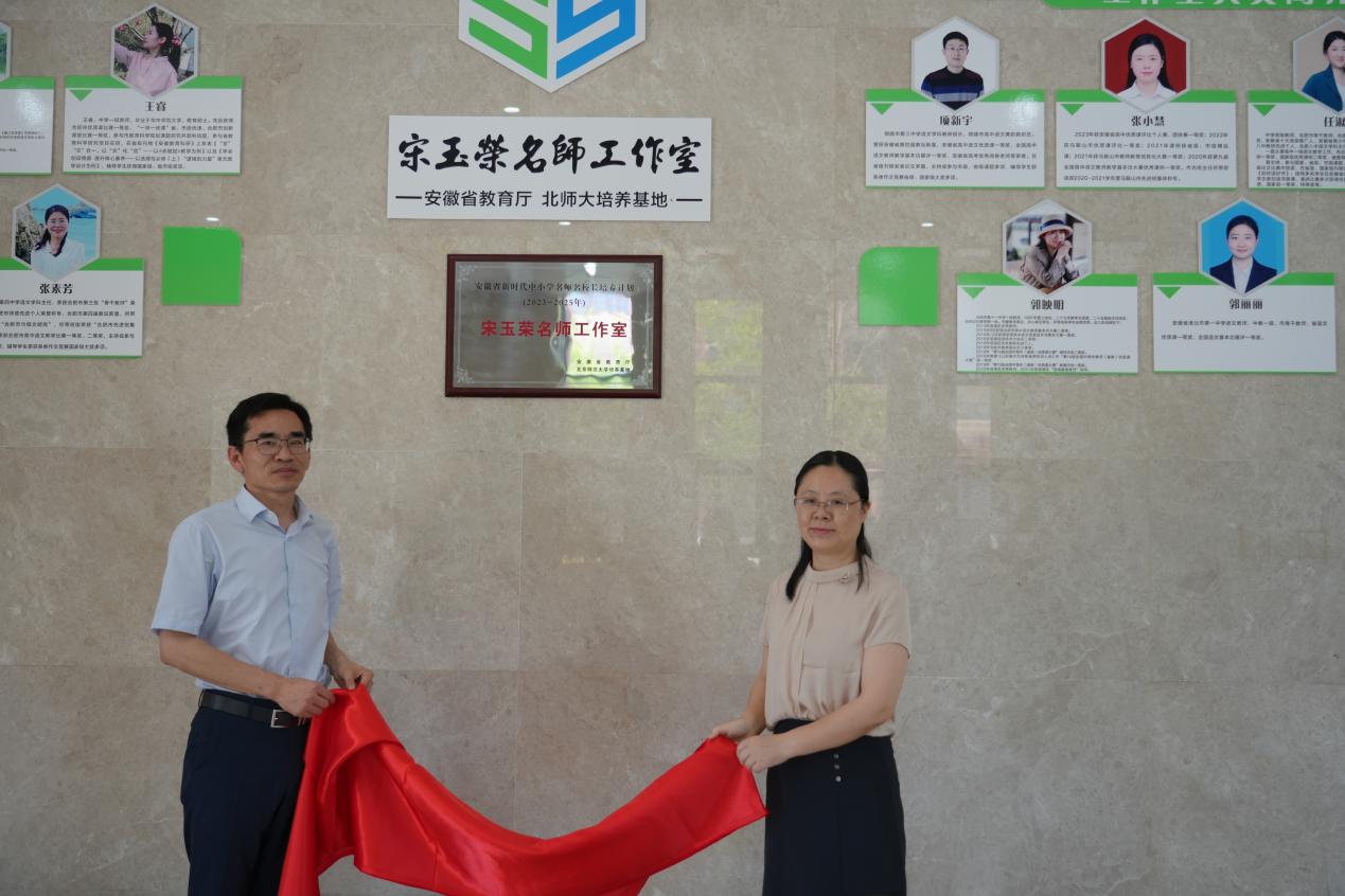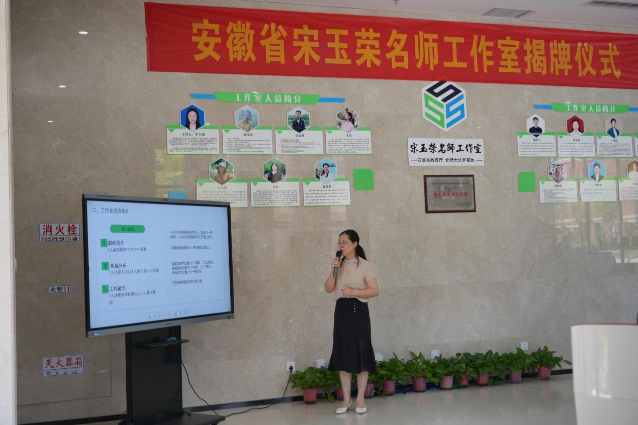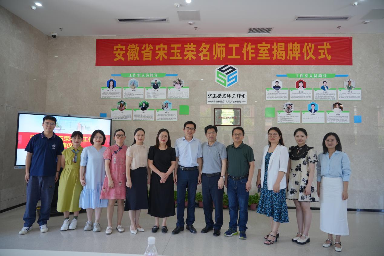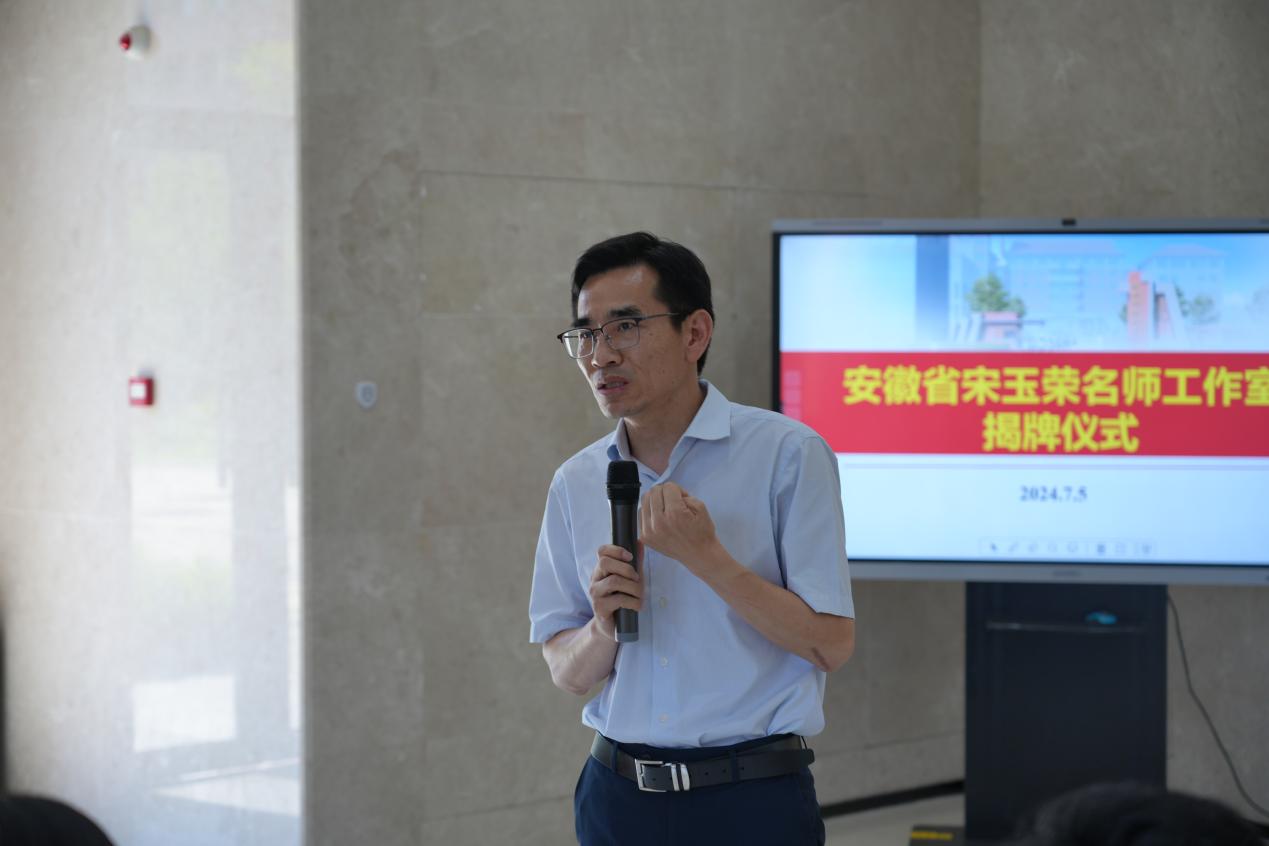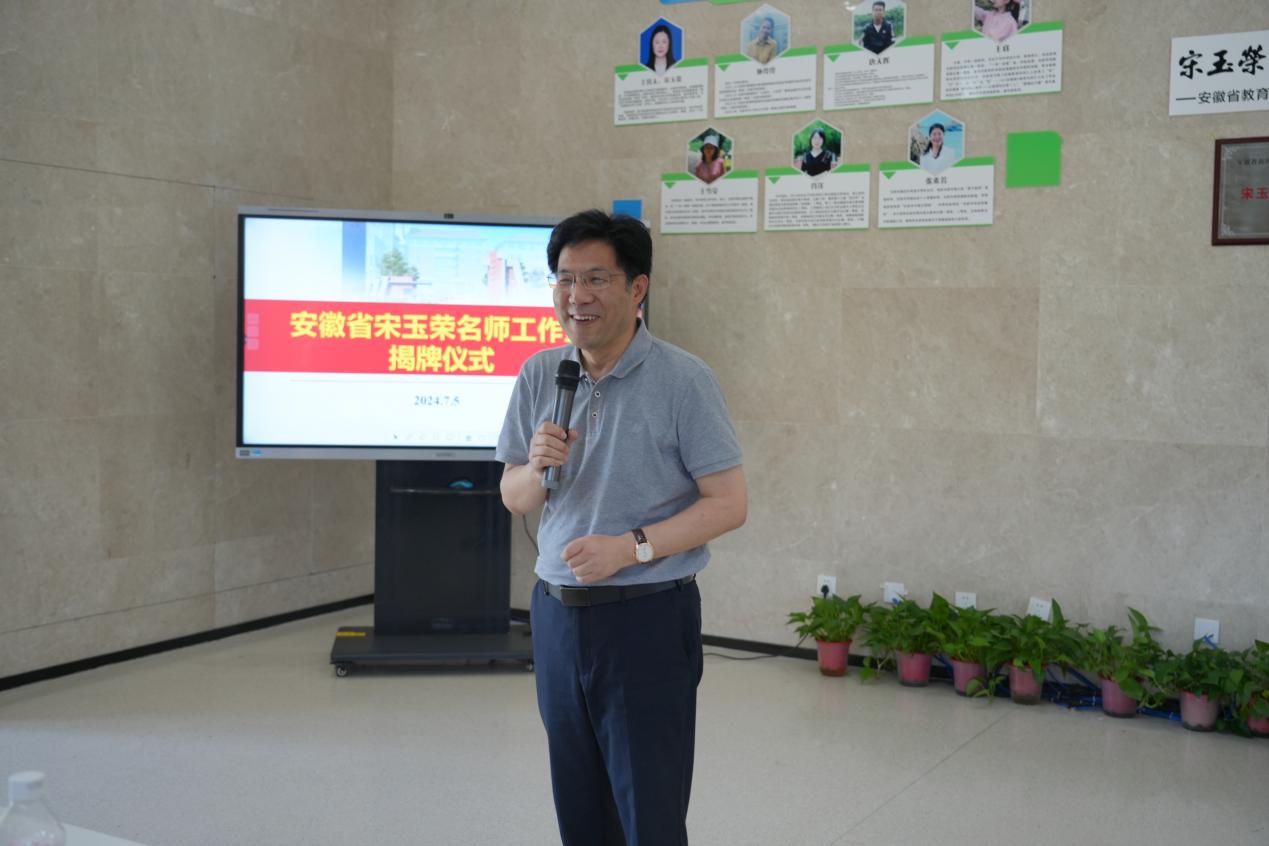 山川草木渐丰盈,人间处处是盛景。为进一步发挥名教师工作室的示范引领作用,深入推进新课程改革,推动教师专业能力提升,2024年7月5日安徽省宋玉荣名师工作室在合肥市第九中学举行揭牌仪式。根据《安徽省教育厅关于公布2023年全省新时代中小学名师名校长培养计划人选名单的通知》,合肥市市属学校中仅三人入选。合肥市教育局教师中心主任张少华、省教研员谢发茹、合肥市第九中学党委副书记、校长张永剑、安徽省正高级教师、特级教师盛庆丰、安徽省宋玉荣名师工作室主持人宋玉荣以及工作室成员共同见证这一激动人心的时刻。本次活动由工作室成员王睿主持。