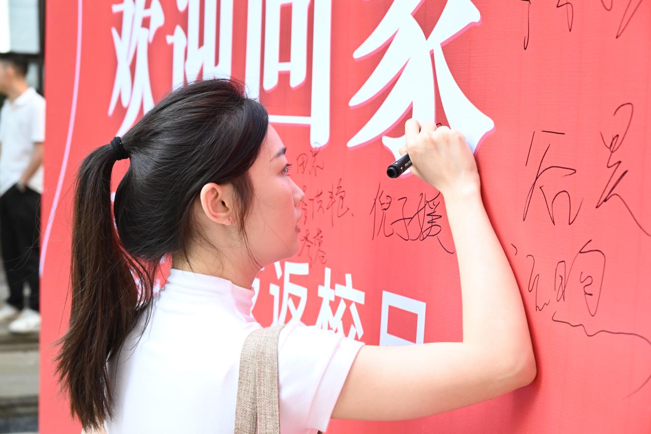 签名墙前,不同届别、不同班级的校友们兴致勃勃地签上自己的名字,并合影留念。以此为记,留一份美好的回忆,照片会成为珍贵的回忆。