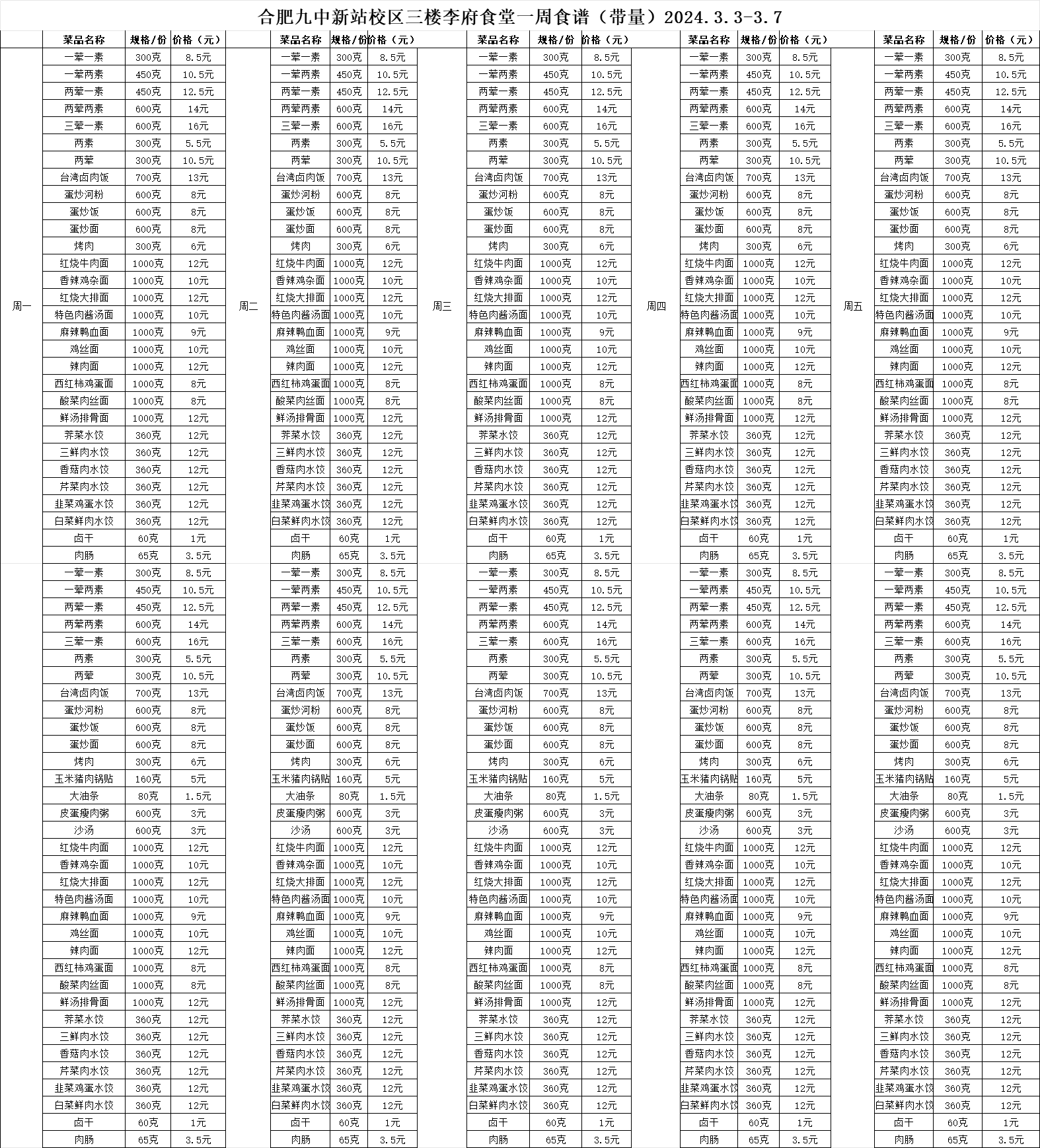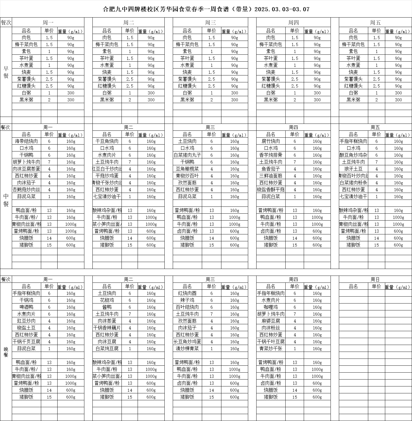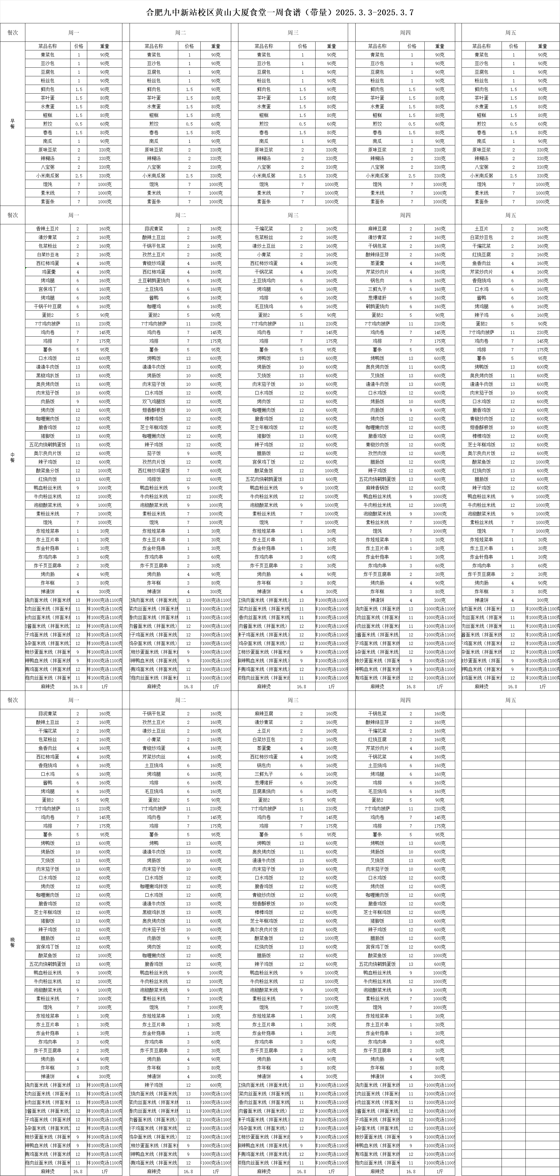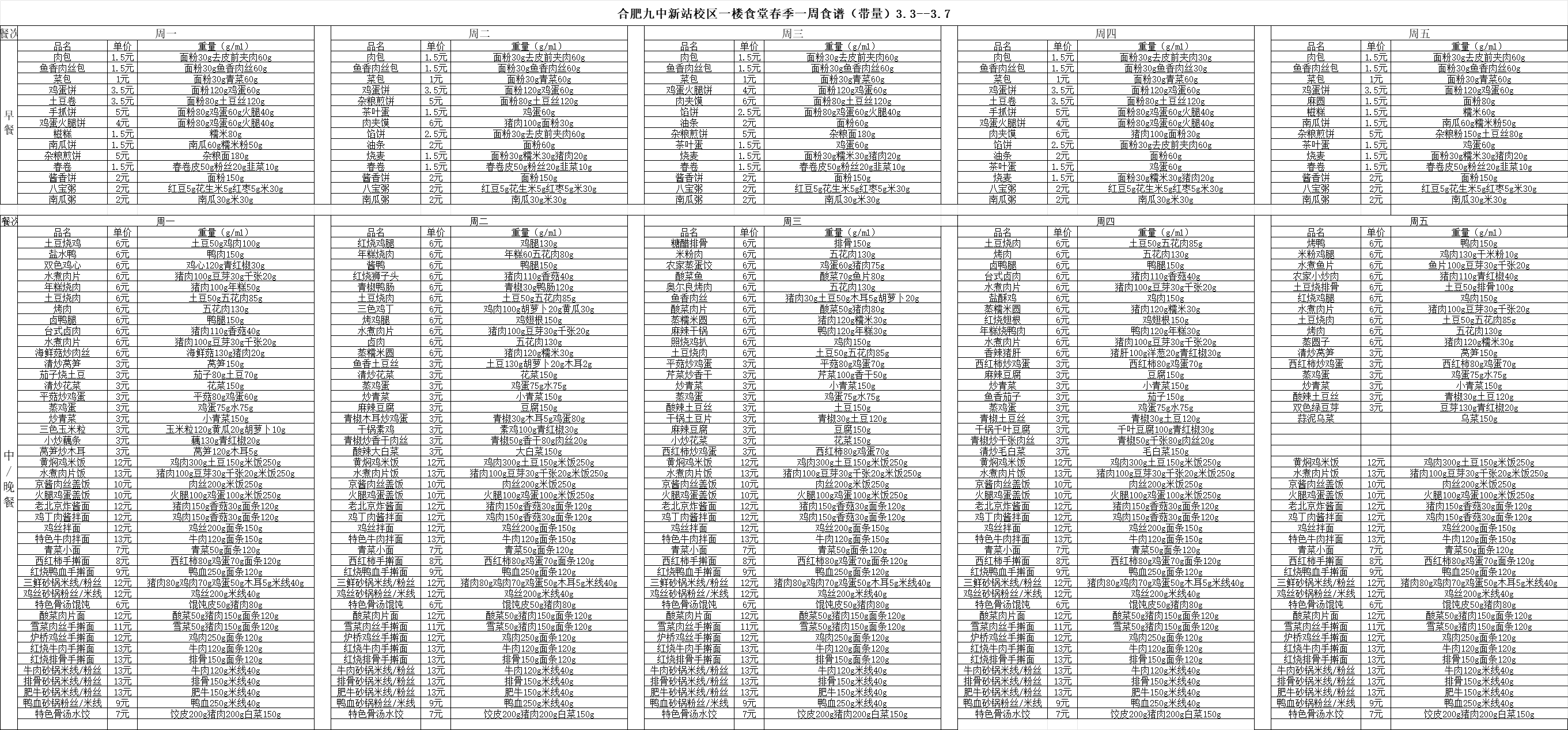 合肥九中“你呼我应”渠道及一周食谱公示(带量)(3.3-3.7)
