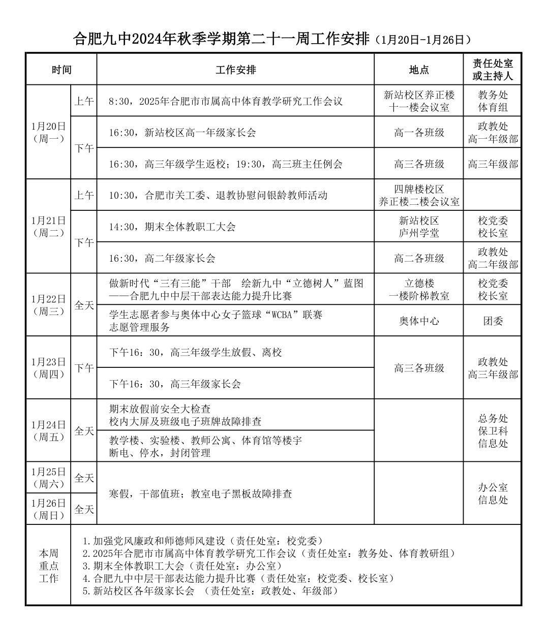 合肥九中2024年秋季学期第二十一周工作安排(1月20日——1月26日)