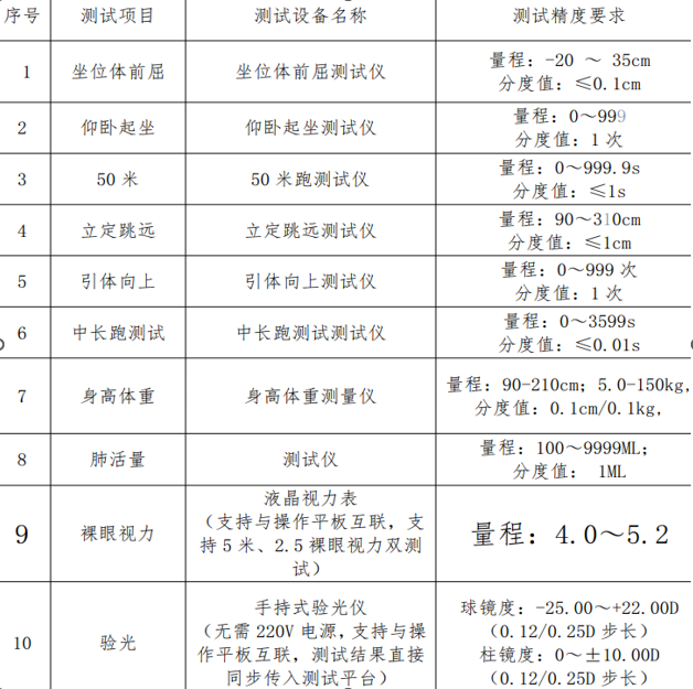 2.投标人须提供足够数量的身高体重、肺活量、50 米跑、坐位体前屈、立定跳远、引体向上(男)、1 分钟仰卧起坐(女)、 中长跑(女子 800 米、男子 1000 米)、左眼裸眼视力、右眼裸眼 视力,左眼屈光球镜 S、右眼屈光球镜 S,左眼屈光柱镜 C、右眼屈光柱镜 C,左屈光轴位 A、右屈光轴位A等各测试项目的测 试设备及所需外设(包括但不限于电源连接线、电池等),按照《国家学生体质健康标准测试项目操作规范与方法(2014 版) 》(含视力测试内容)要求进行测试(测试项目见附表二)。