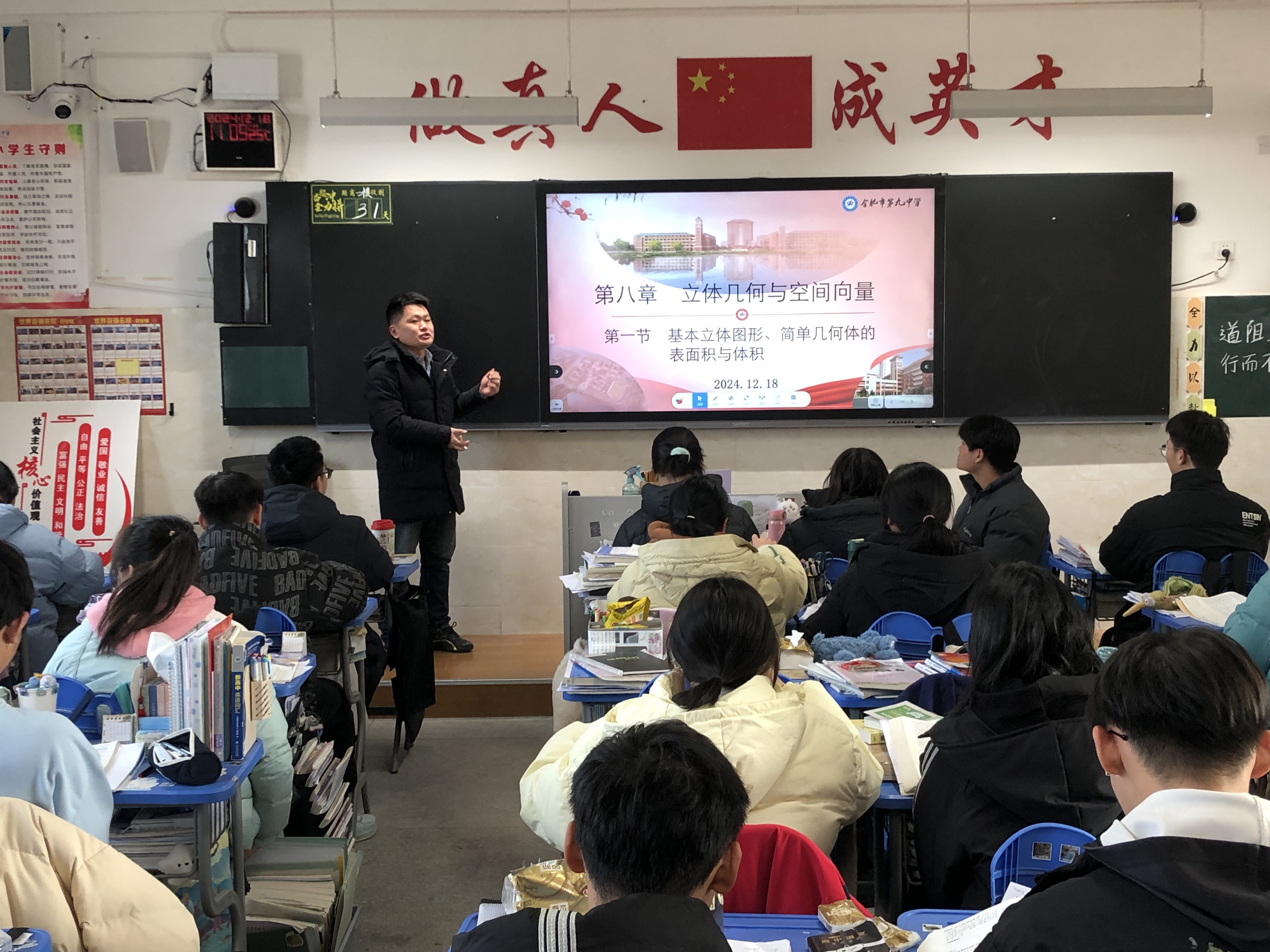 李阳老师一轮复习课课题为《基本立体图形、简单几何体的表面积与体积》。李老师从基础知识的回顾梳理到重点难点的精准突破,每一个教学环节都紧密相扣,层次分明。他通过多样化的教学手段,如多媒体演示、小组合作探究、经典例题举一反三,充分调动了学生的课堂参与度,让学生们在积极思考与互动交流中,逐步攻克数学难题,构建起扎实的知识体系,展现出了高三数学课堂应有的高效与活力。
