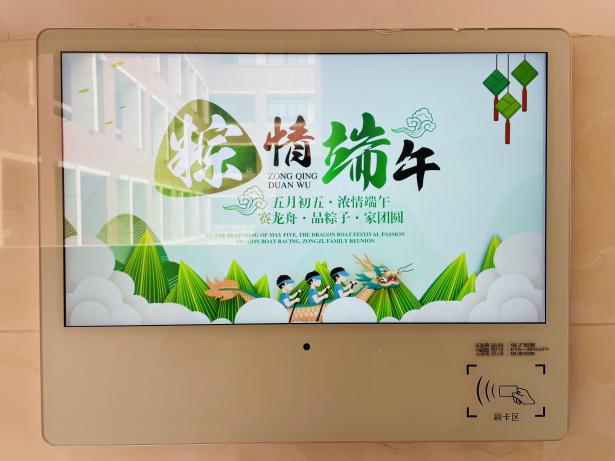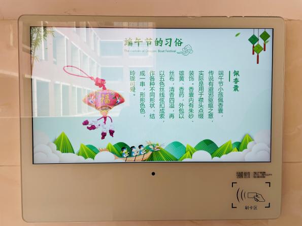 年级部充分利用电子班牌,推送端午节主题宣传材料,包括端午节由来、端午习俗、端午诗选等内容,在尺寸屏幕中营造节日氛围,在潜移默化中进行传统文化教育。