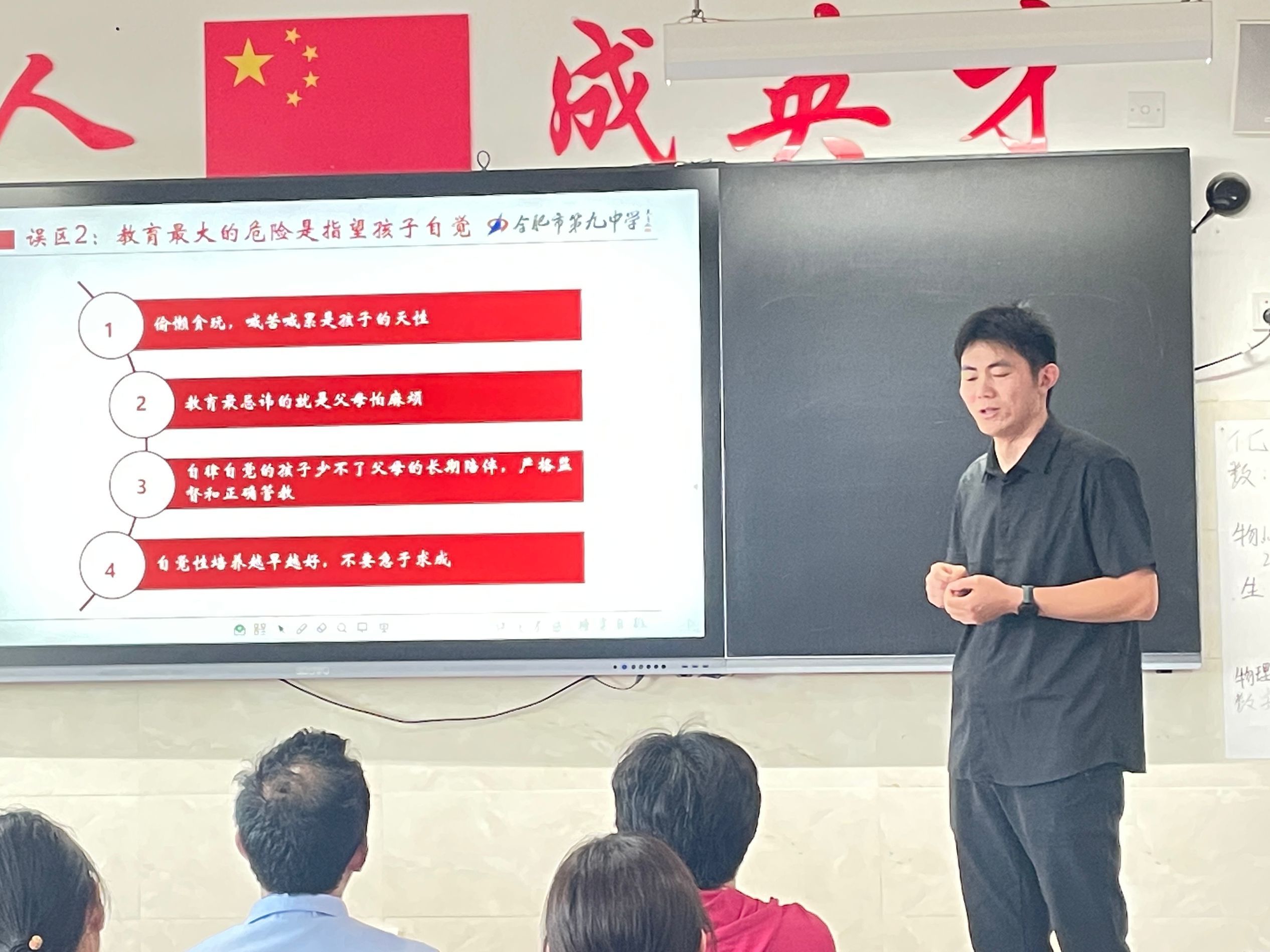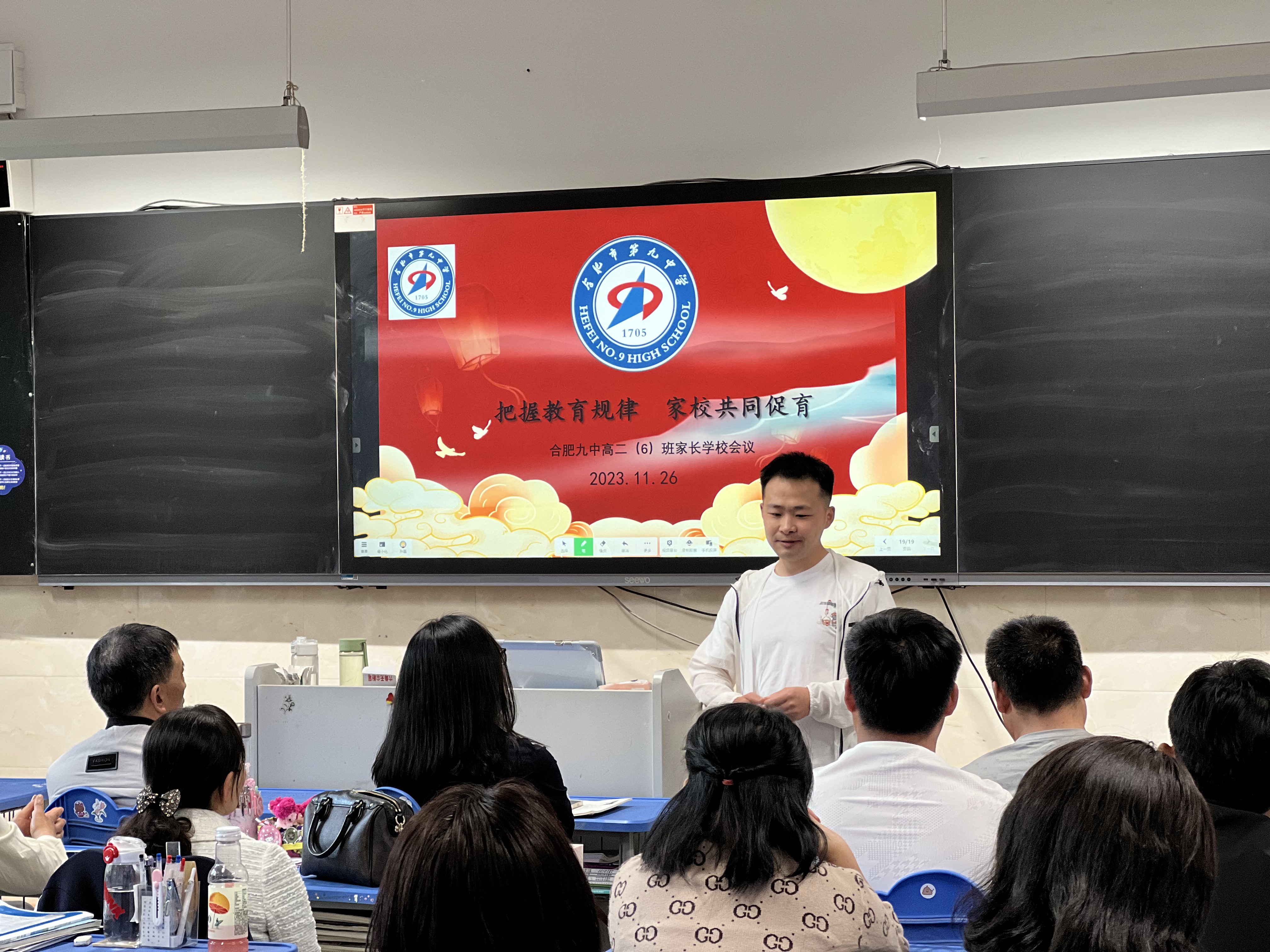 合肥九中党委委员、副校长范玮代表学校向各位家长的到来致以热烈的欢迎和衷心的感谢。他向家长们介绍了年级此次联考的基本情况,从以德育为先、教学为重、学生为本三个方面展示年级管理理念与成果,对学校后期工作规划进行解读,让家长对学校有更深入的了解。同时建议家长要注重倾听、尊重、鼓励孩子的想法,积极配合学校的各项工作,共同促进孩子的全面发展。