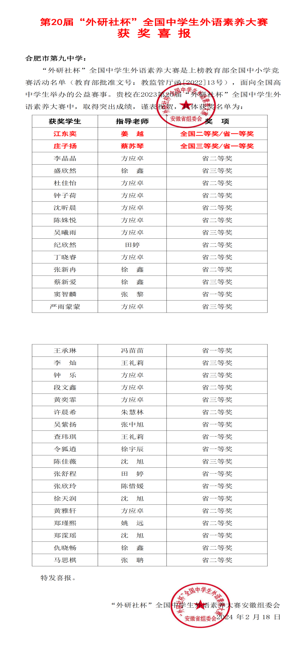 2024年第20届“外研社杯”外语素养大赛刚刚落下帷幕。经过激烈的角逐,合肥九中多名学生脱颖而出,入围安徽省决赛,最终共33名同学获奖,省一等奖11人,二等奖14人,三等奖8人,其中高三年级江东奕同学、高二年级庄子杨同学晋级全国赛,分获全国赛二等奖和三等奖。