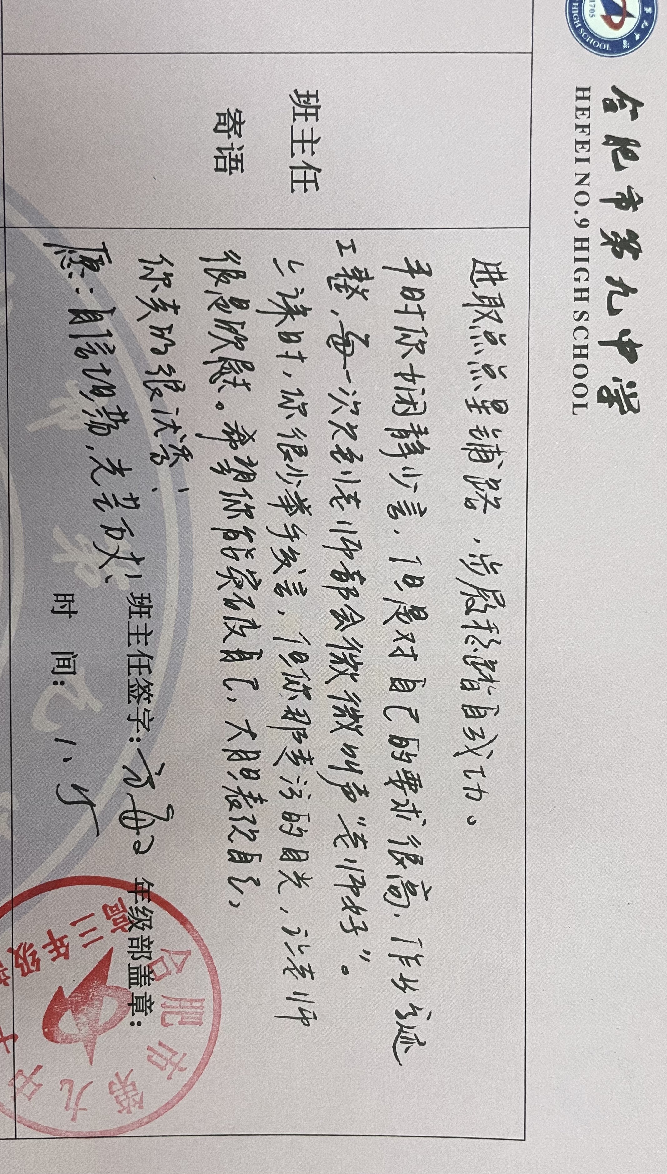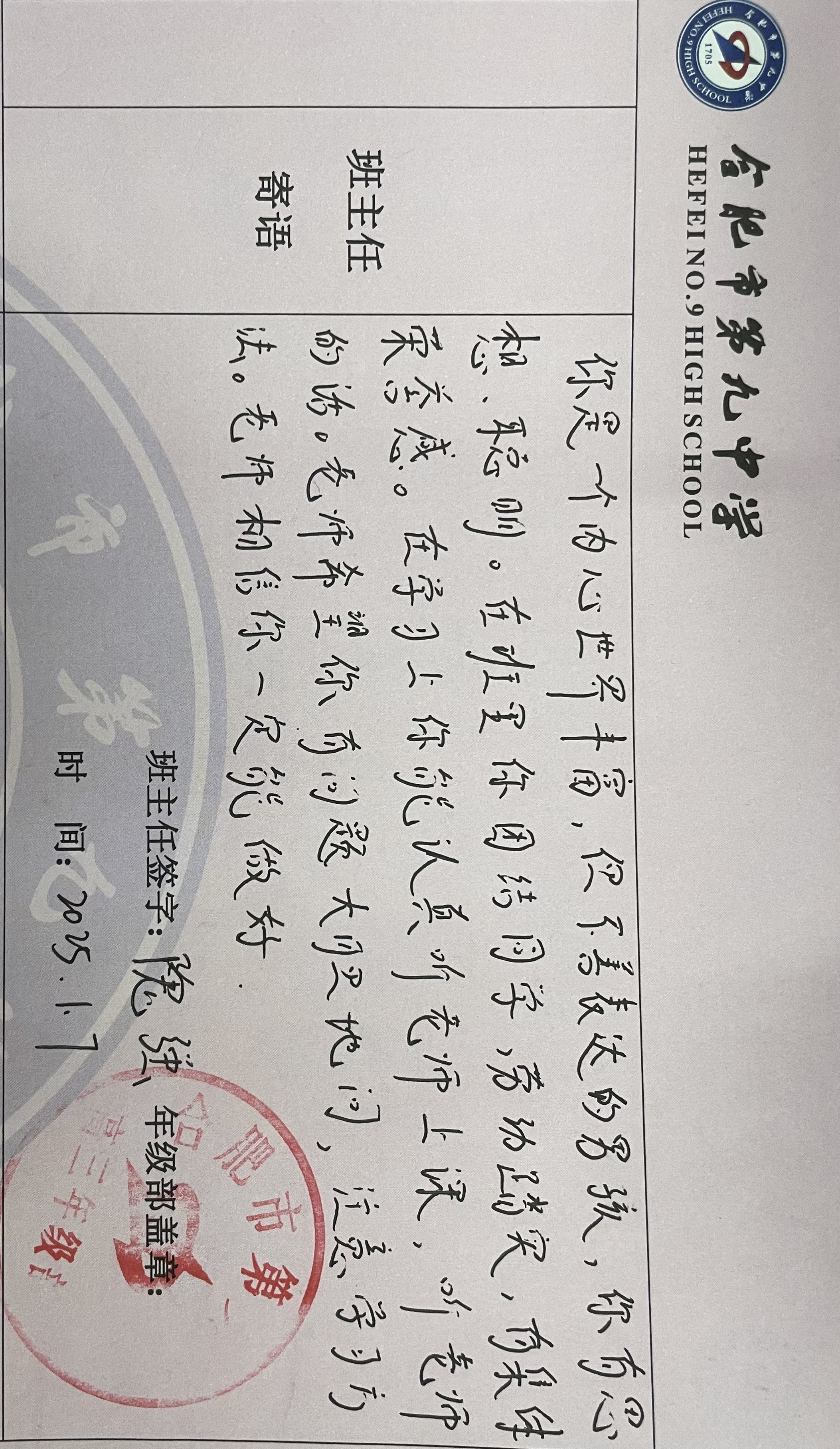 好的评语是班主任用心了解的成果,是对学生进行精神补给的有效途径,更是架起了师生交流、家校交流的桥梁。在学校政教处的统一部署下,合肥九中高三年级班主任们在紧张忙碌的期末迎考阶段,为学生送上了特色走心评语,彰显了九中德育人的教育情怀。