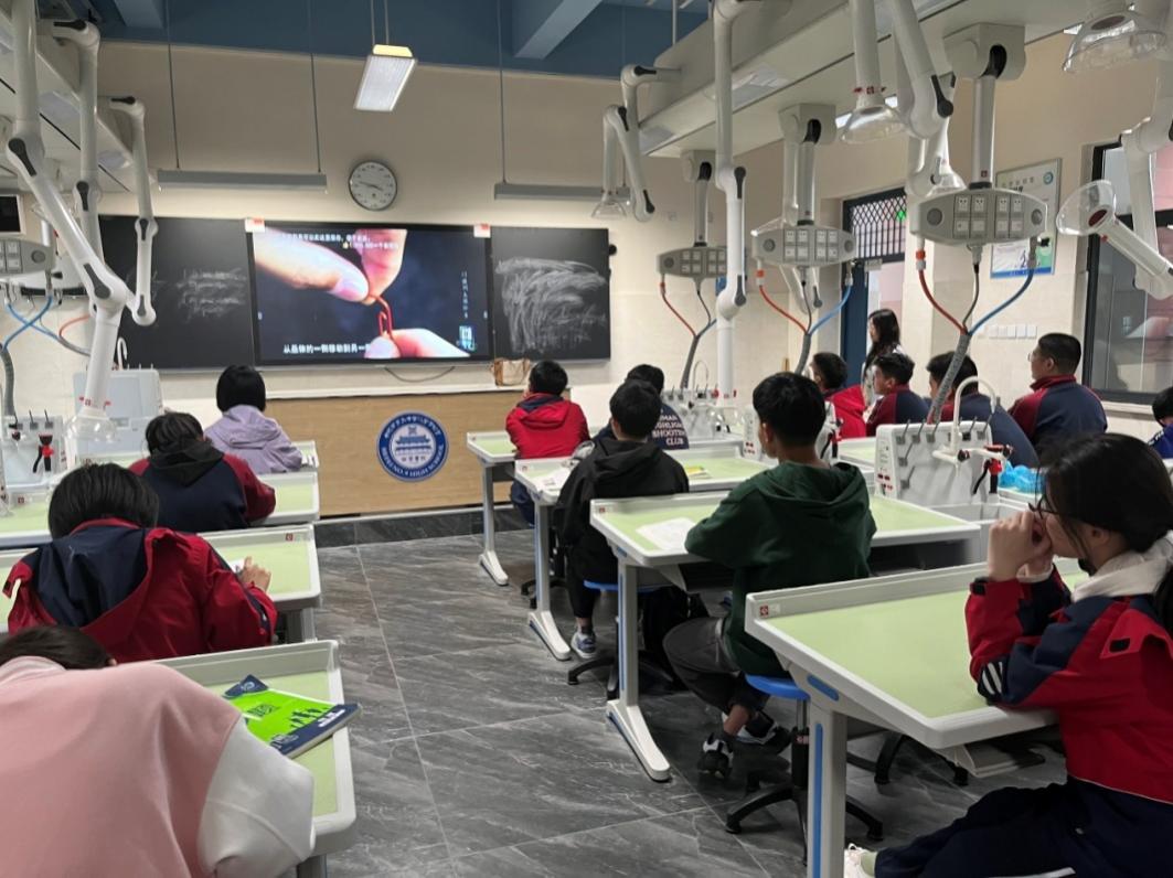 化学类校本课程在化学实验室开展。同学们来到实验楼,在专业化的教室学习。在化学校本课程中,学生们在教师指导下亲手操作,进行简单的化学实验。 这不仅是一次对化学知识的深入学习,更是对学生们科学探究能力的锻炼和提升。随后,同学们也观看了化学相关的纪录片,在科普纪录片作品中了解更加深奥的化学知识。化学作为一门实验科学,其实践性和应用性不言而喻。而化学校本课正是将化学知识与实践技能相结合,让学生在实践中学习,全面提升学生们的科学素养和实践能力。