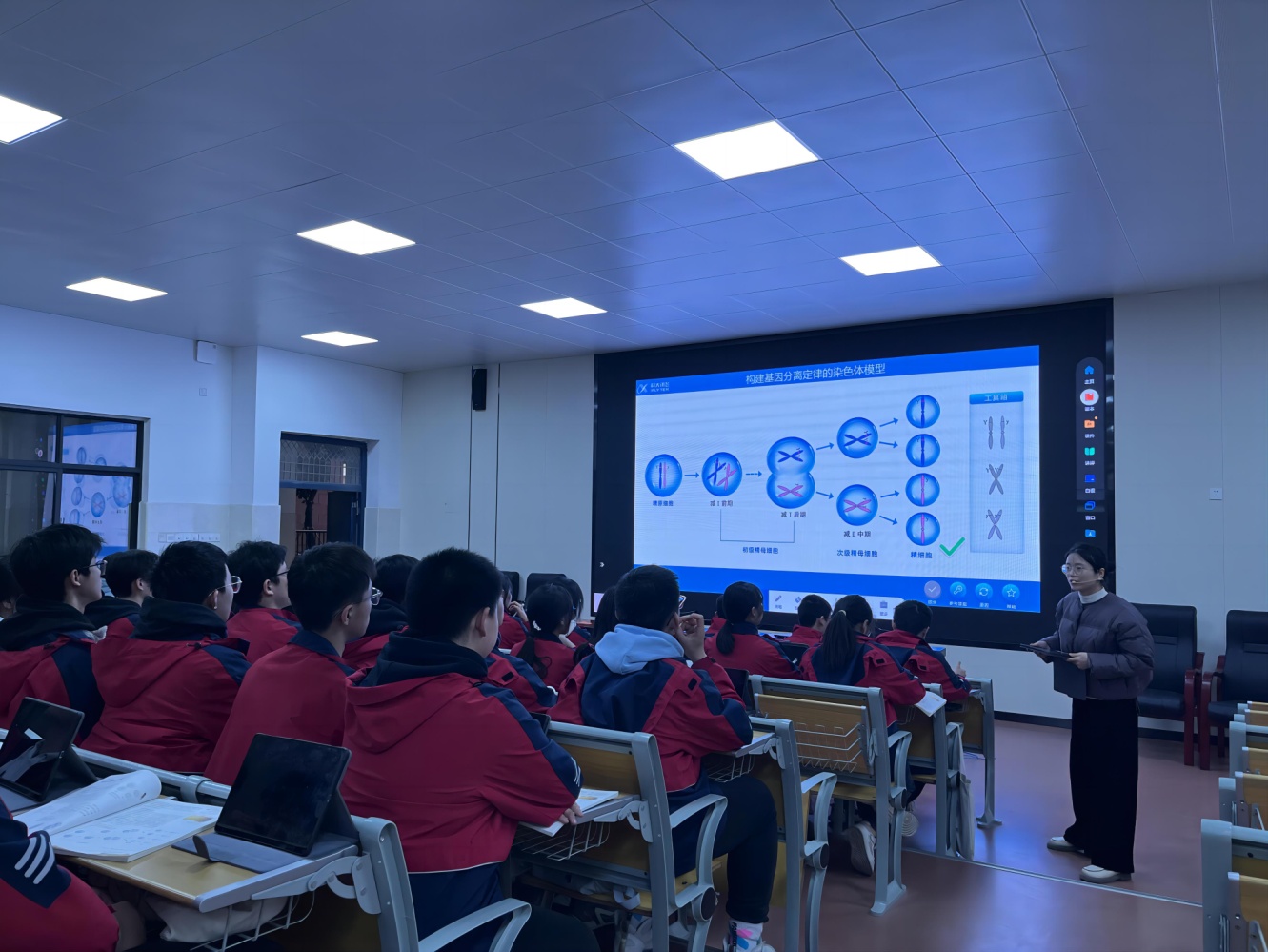本次活动分为四个环节,首先由高三年级李小会老师带来基于平板应用的智慧课堂教学展示课,在师生互动、模型展示等方面充分发挥了平板带来的便利。展示课结束后,李小会向参会教师分享了自己的使用经验,可以借助平板丰富教学资源,更好地实现课堂的直观呈现和师生互动,更高效地得到学生学习情况的反馈。