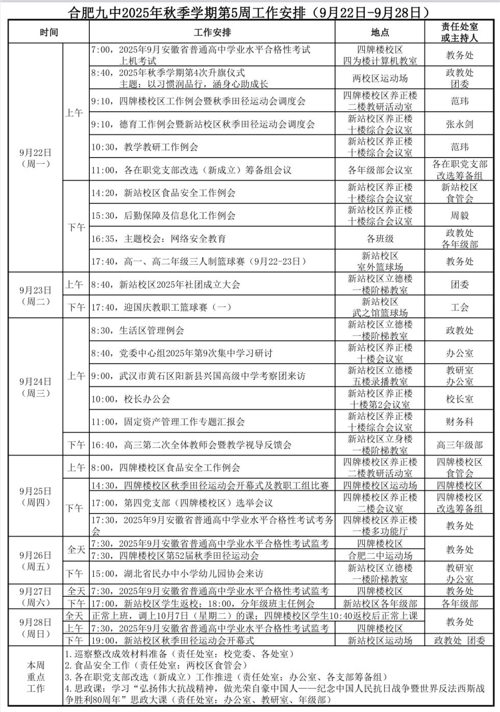 合肥九中2025年秋季学期第5周工作安排(9月22日——9月28日)