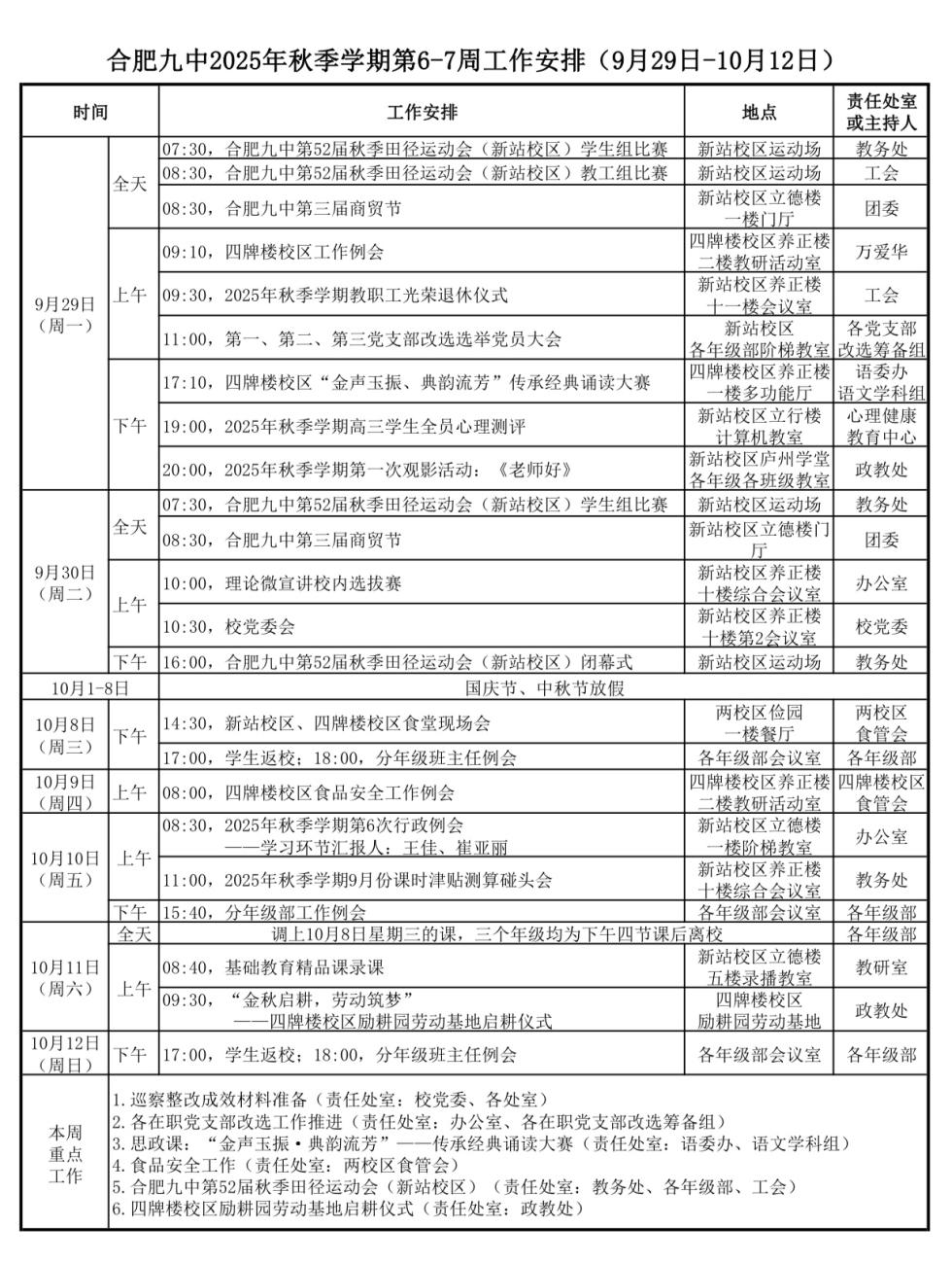 合肥九中2025年秋季学期第6-7周工作安排(9月29日——10月12日)