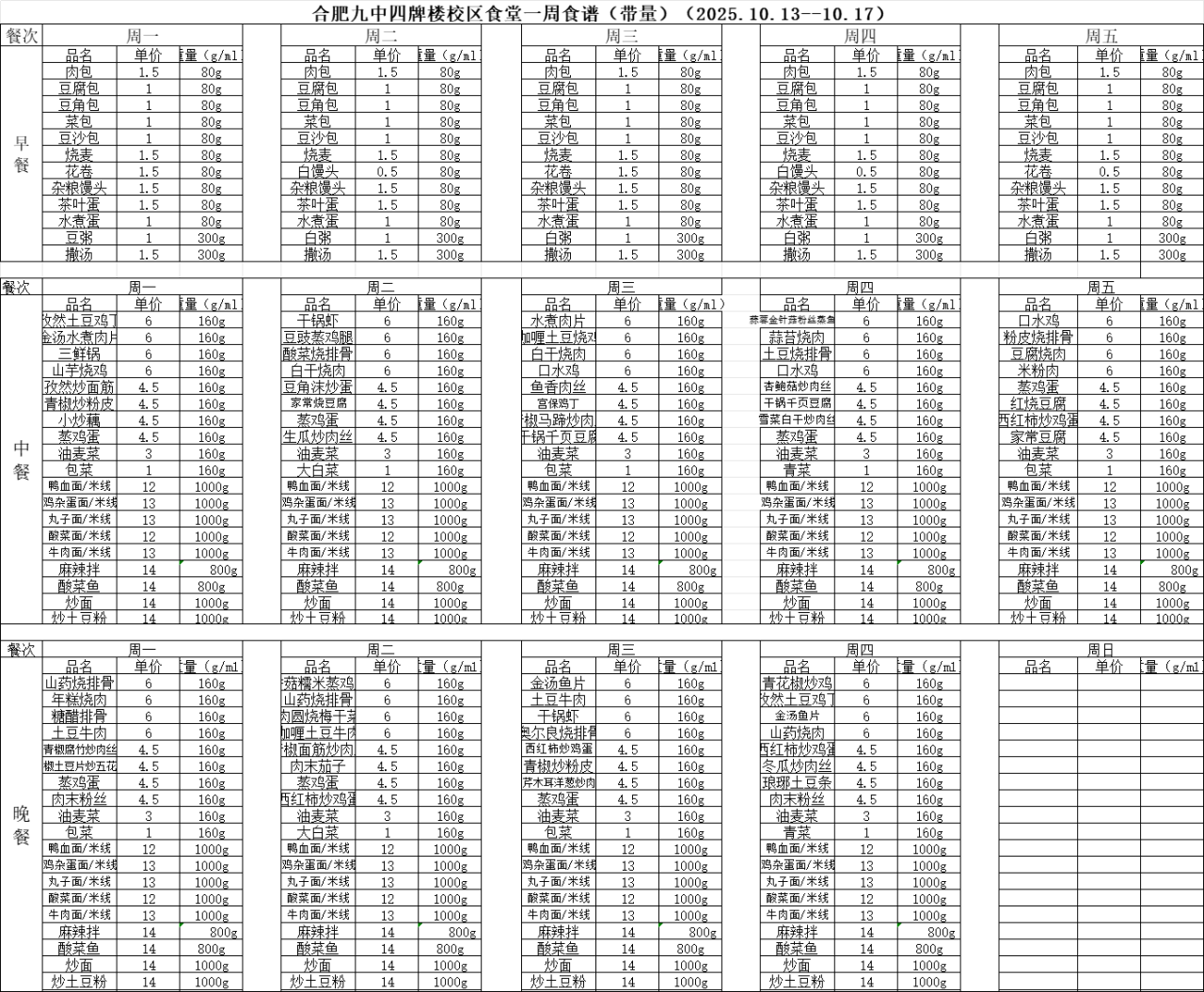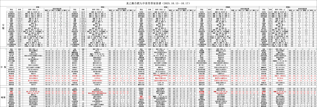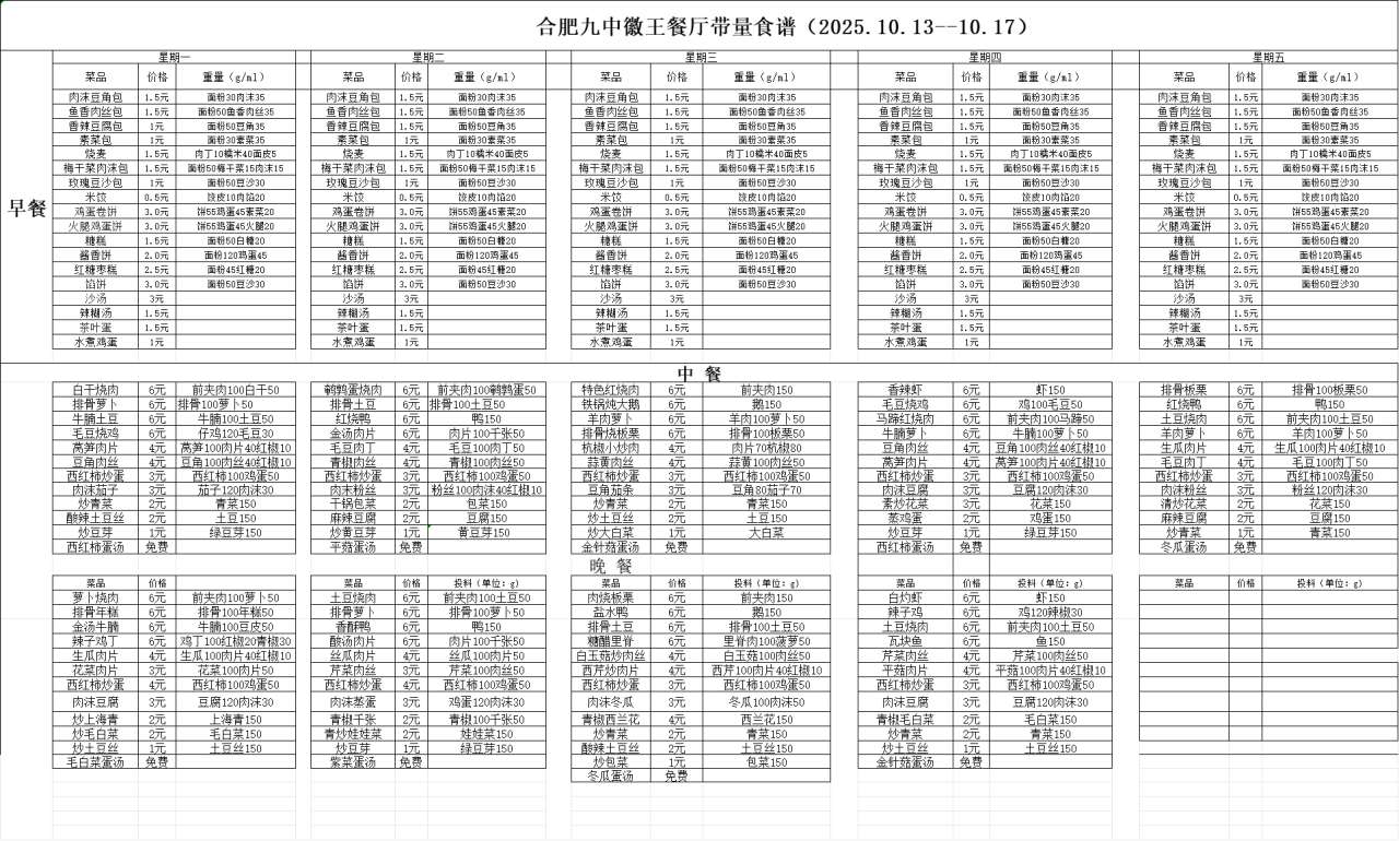 合肥九中“你呼我应”渠道及一周食谱(带量)10.13—10.17
