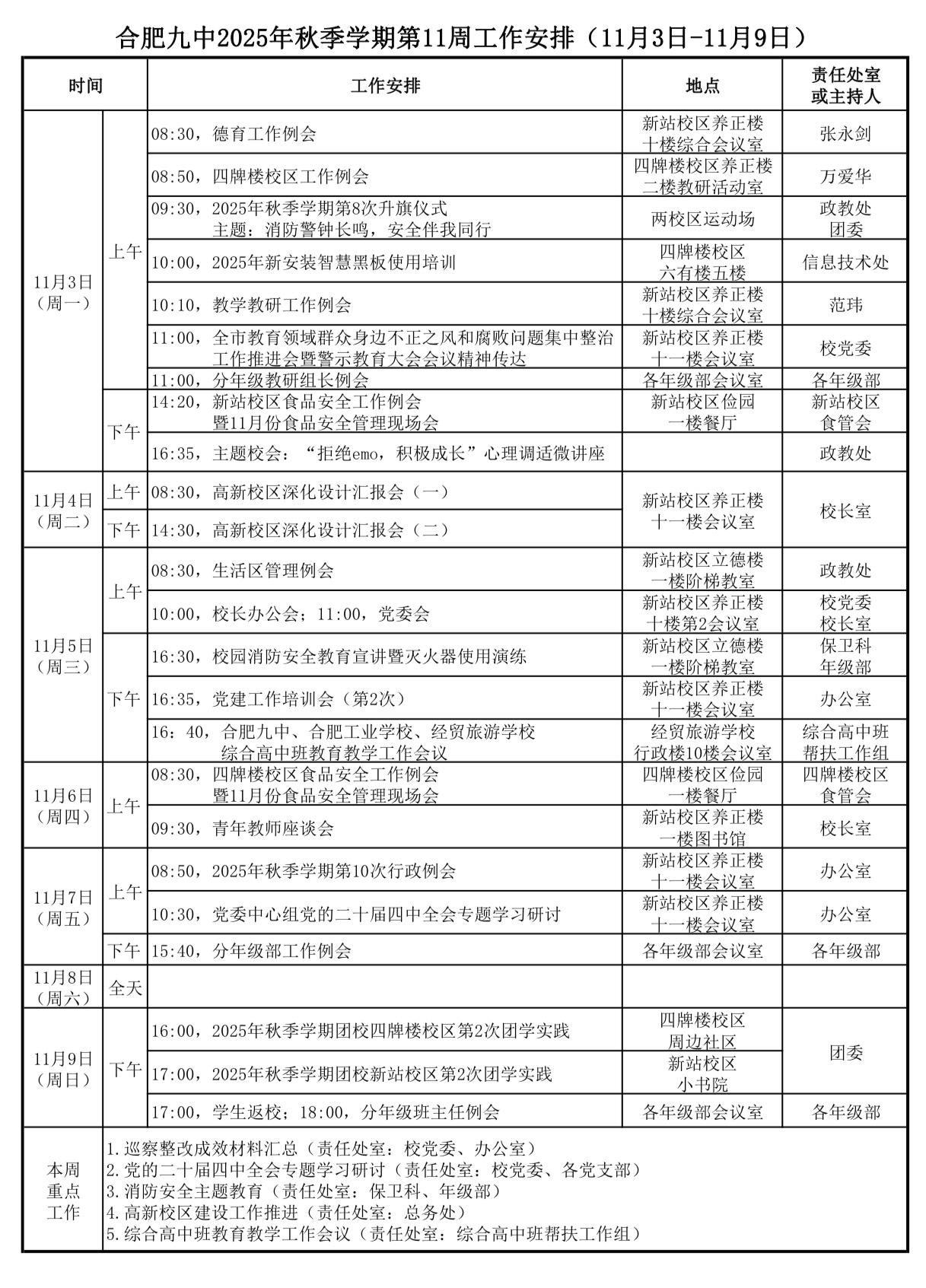 合肥九中2025年秋季学期第11周工作安排(11月3日——11月9日)