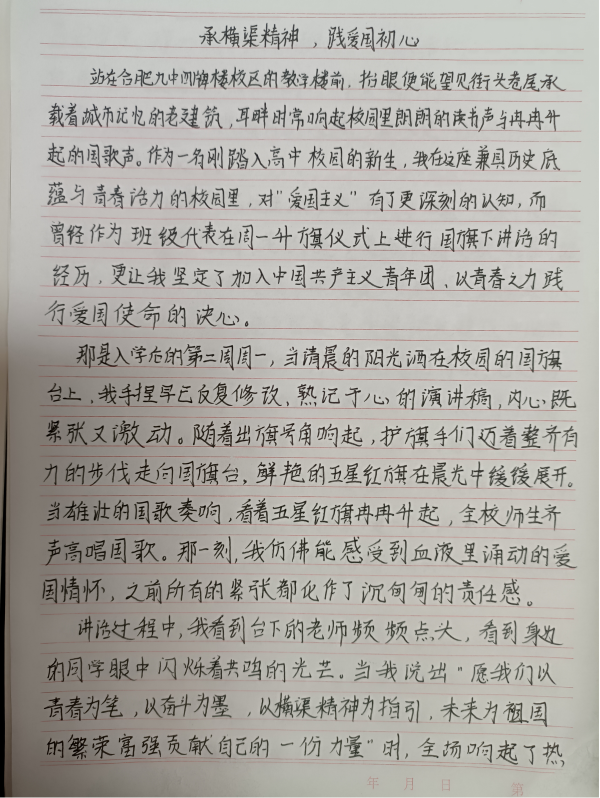 金秋十月,合肥九中四牌楼校区以“立德树人”为引领,于10月26日至11月2日组织2025学年入团积极分子开展爱国主义主题学习实践活动。通过征文与手抄报创作双轨并行,学子们以青春视角解读家国情怀,以艺术语言诠释责任担当,交出了一份份“有温度、有深度、有力度”的红色答卷,生动彰显了九中“以德润心、以文化人”的育人特色。