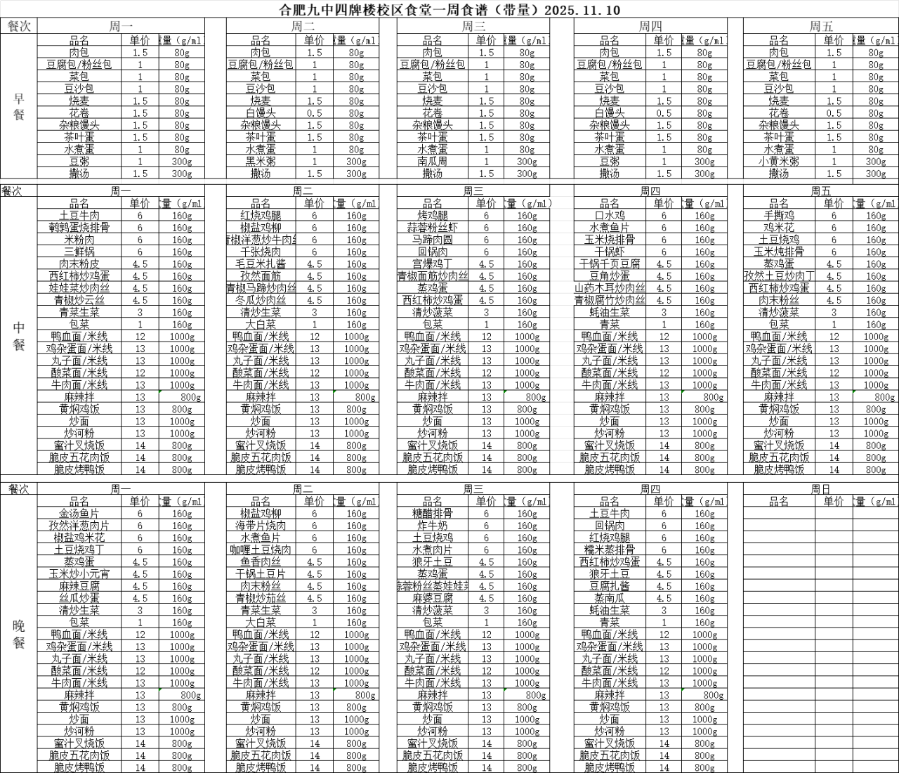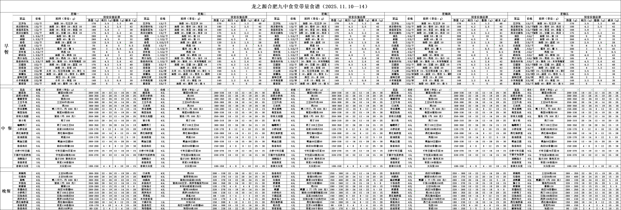 合肥九中“你呼我应”渠道及一周食谱(带量)11.10—11.14
