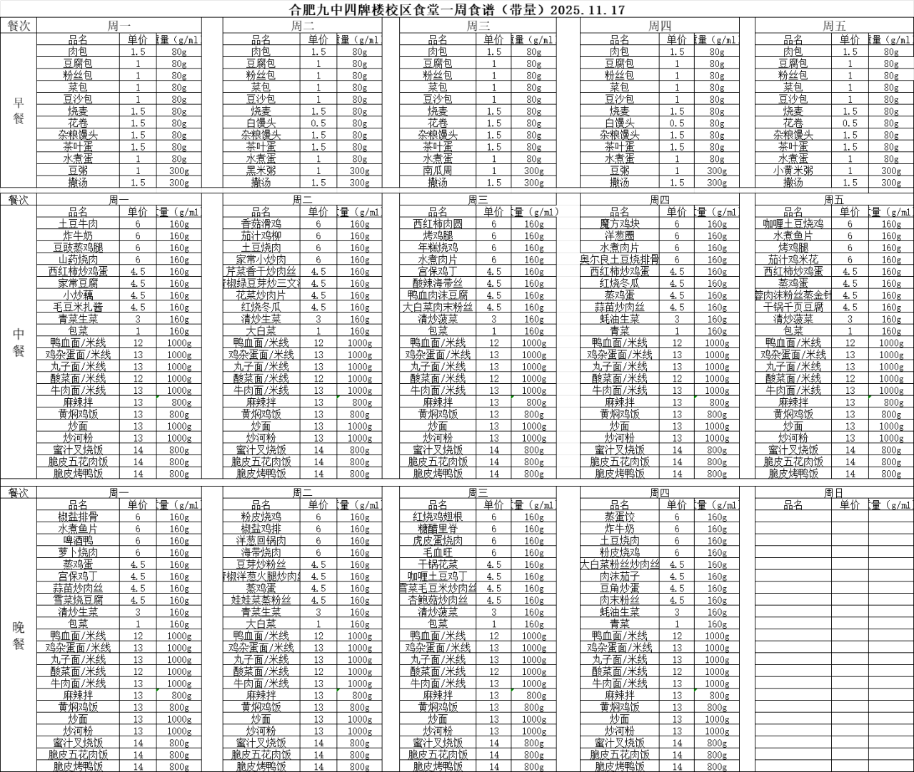 合肥九中“你呼我应”渠道及一周食谱(带量)11.17—11.21