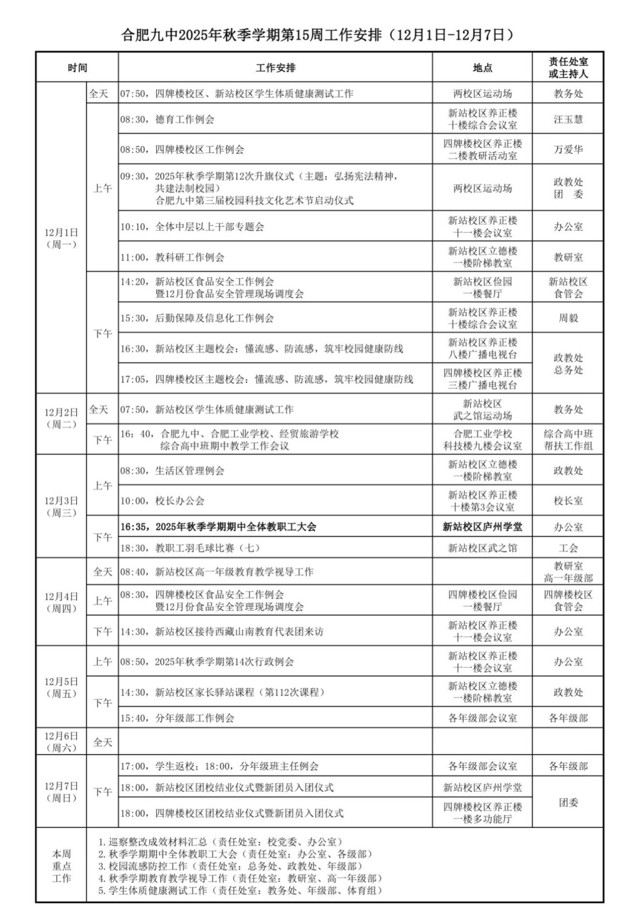 合肥九中2025年秋季学期第15周工作安排(12月1日——12月7日)