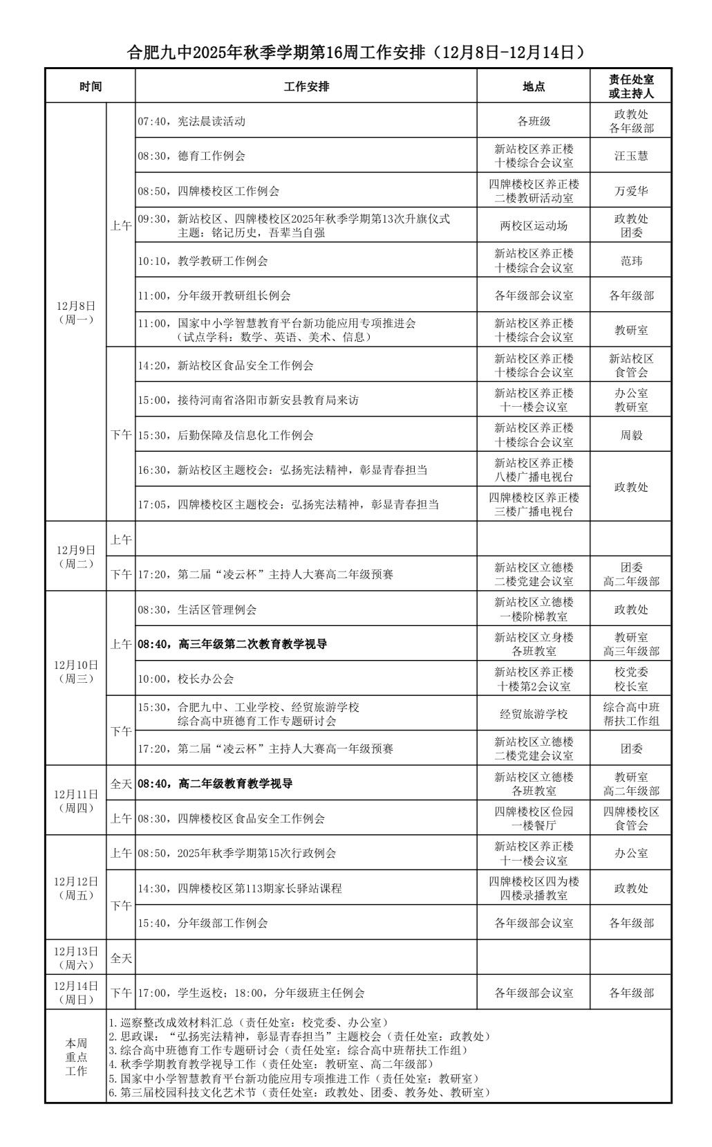 合肥九中2025年秋季学期第16周工作安排(12月8日——12月14日)