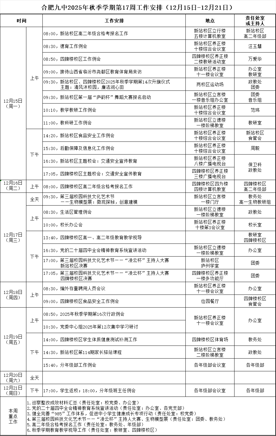 合肥九中2025年秋季学期第17周工作安排(12月15日——12月21日)
