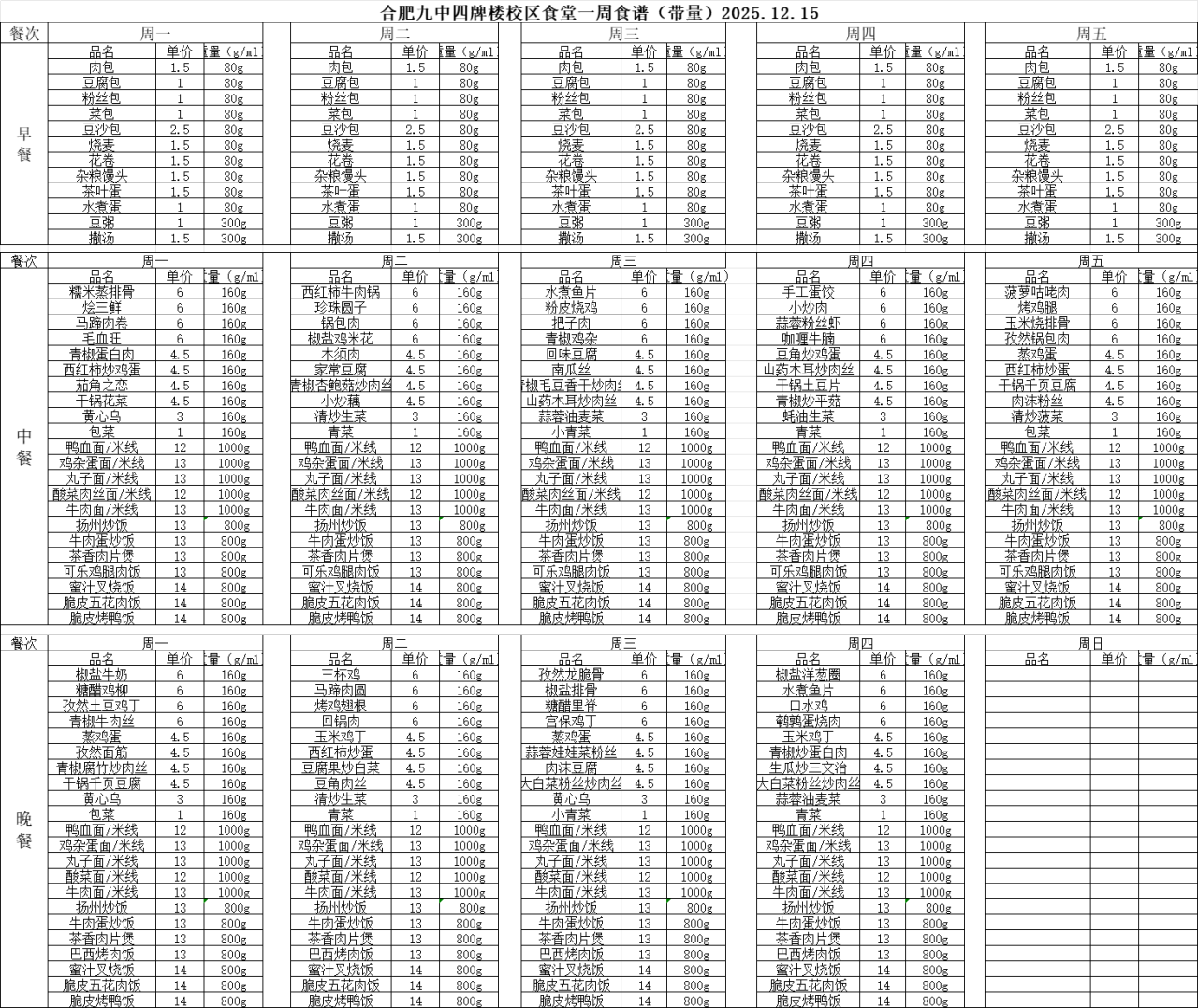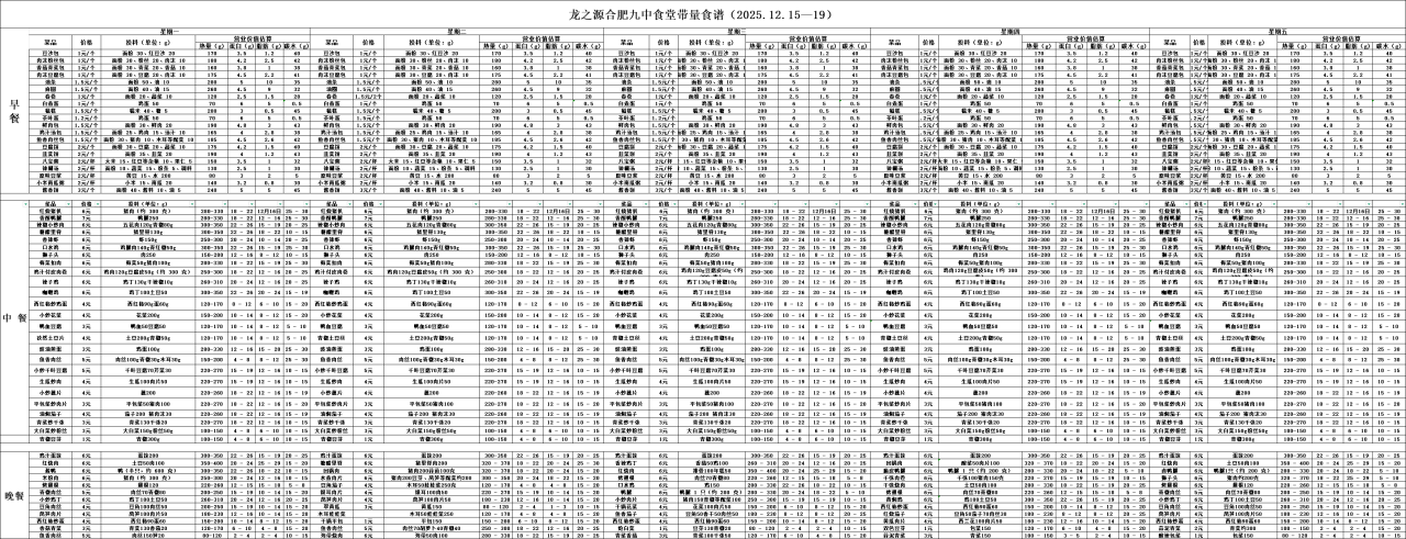 合肥九中“你呼我应”渠道及一周食谱(带量)12.15—12.19